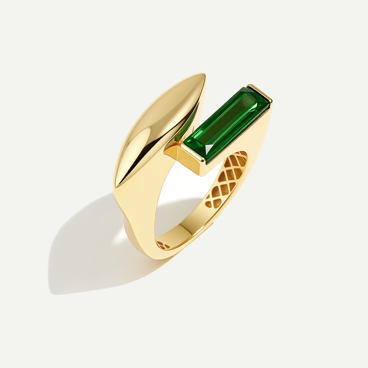 Merkezinde yer alan şık yeşil baget taş, sade altın gövdenin zarafetini vurgularken güçlü bir odak noktası oluşturur. Parlak yüzeyiyle ışığı yansıtan Baget 14 Ayar Altın Yeşil Taşlı Yüzük, minimal detaylarıyla şıklığı ön plana çıkarır. Günlük kombinlere zarif bir dokunuş kazandırırken özel gecelerde de dikkat çekici bir tamamlayıcı olur. Regold logolu özel kutusunda ve garanti belgesi ile sunulmaktadır.
