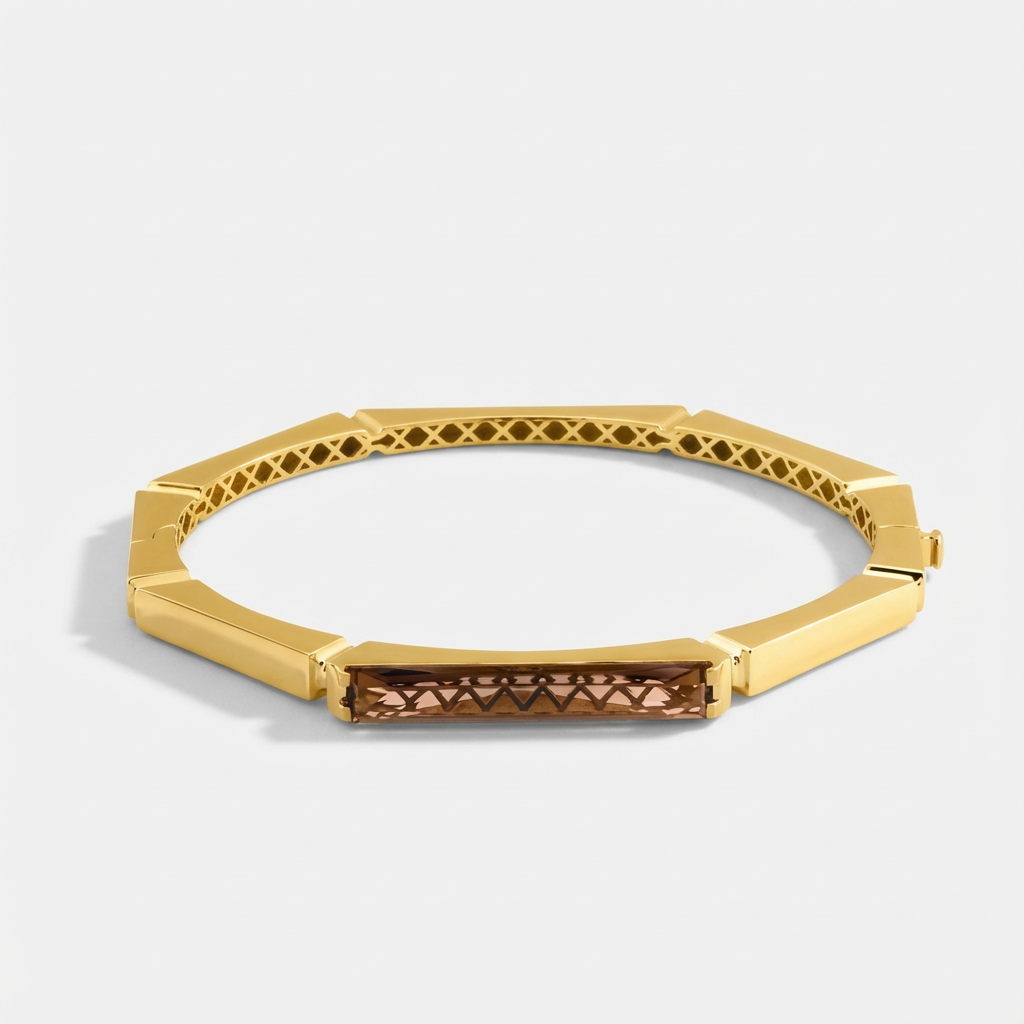 Canlı kahverengi baget taşlarıyla süslenen bu 14 Ayar Altın Kahverengi Baget Taşlı Kelepçe, geometrik ve modern tasarımıyla bileğinize iddialı ve göz alıcı bir dokunuş katıyor. Hem özel günlerde hem de günlük kullanıma uygun olan bu tasarım, stilinizin zarif tamamlayıcısı olur.