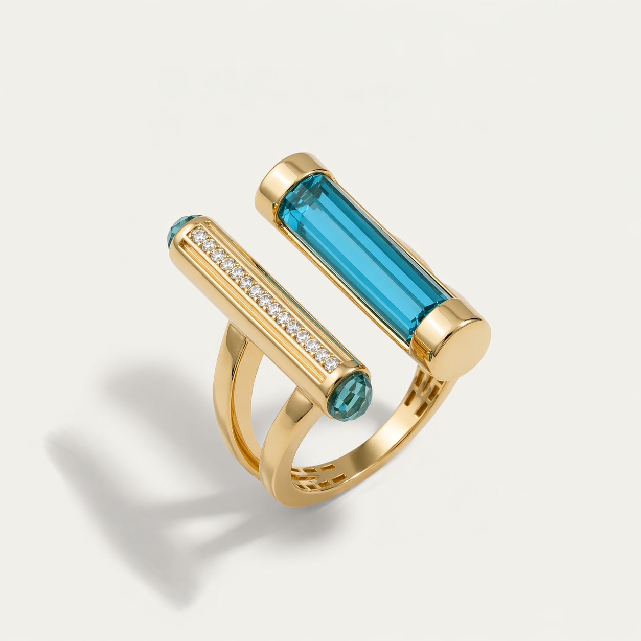 14 Ayar Altın Mavi Taşlı Modern Yüzük, cesur ve şık tasarımıyla dikkat çeker. İki paralel formdan oluşan yüzüğün bir tarafında uzun mavi taş, diğer tarafında ise küçük taşlarla süslenmiş ince bir şerit bulunur. Asimetrik ve modern çizgisiyle farklı stil arayanlar için mükemmel bir seçimdir. Regold logolu özel kutusu ve garanti belgesiyle sunulmaktadır.