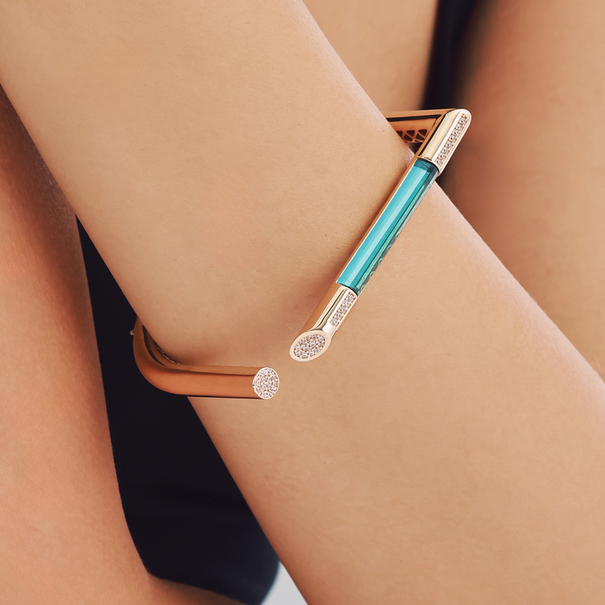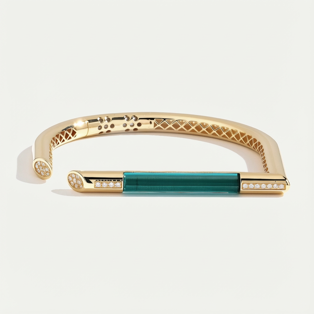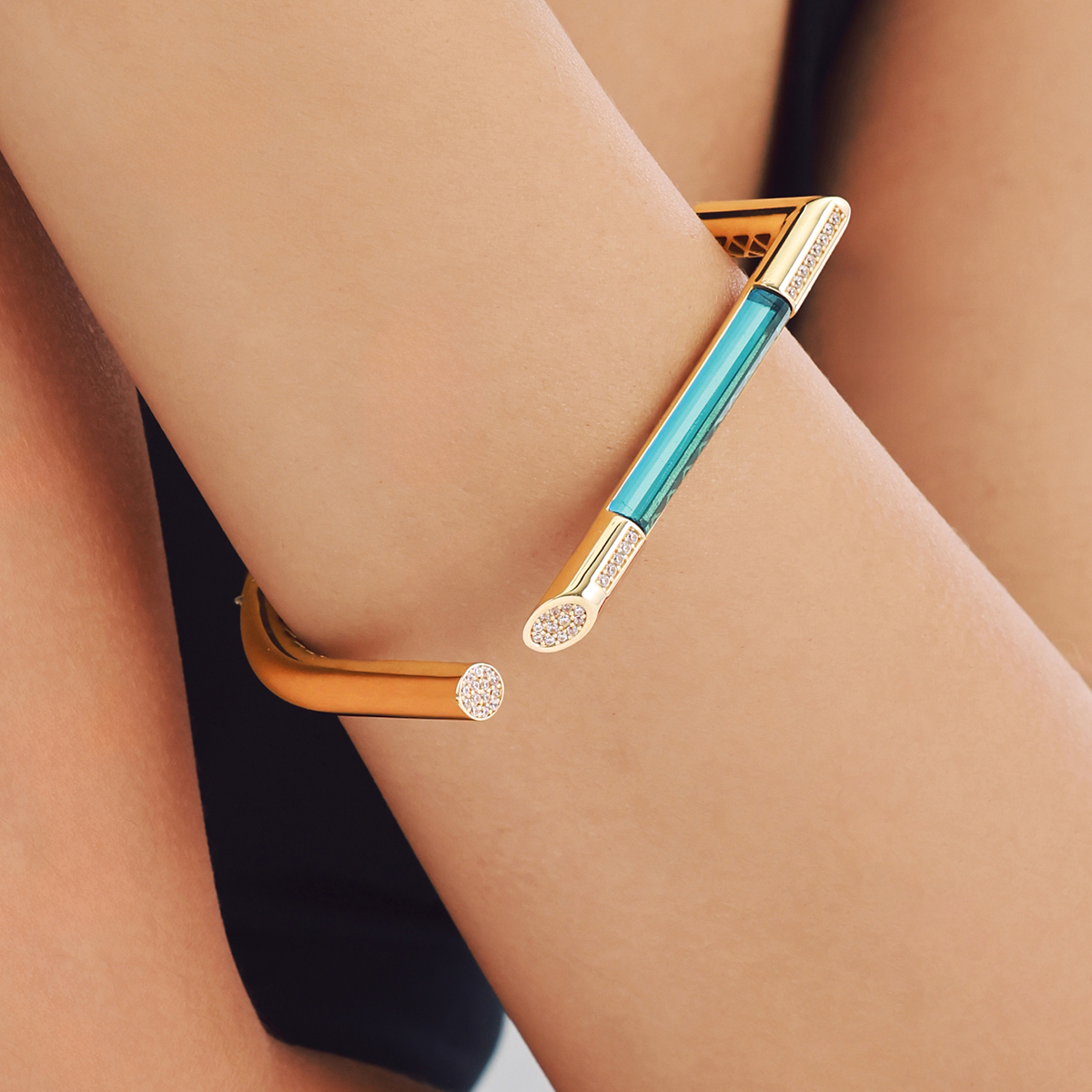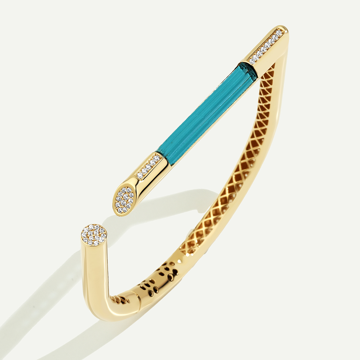 Mimari çizgilerle asimetrik zarafeti buluşturan Baget 14 Ayar Altın Mavi Taşlı Kelepçe, bileğinizde modern bir sanat eseri duruşu sergiler. Parlak altından üretilen bu kelepçenin üst kolu, canlı mavi renkteki silindir formlu uzun bir taş ile vurgulanırken, taşın çevresi ve diğer kolun ucu pırıltılı beyaz taşlarla süslenmiştir. Tasarımın bu cesur ve dengesiz yapısı, parçaya benzersiz bir dinamizm katar. İç yüzeyindeki lüks petek deseni işçilik kalitesini tamamlarken, bu kelepçe çarpıcı renk kontrastıyla stilinize iddialı bir imza atar. Regold logolu özel kutusunda ve garanti belgesi ile sunulmaktadır.