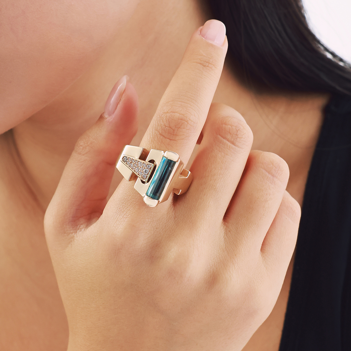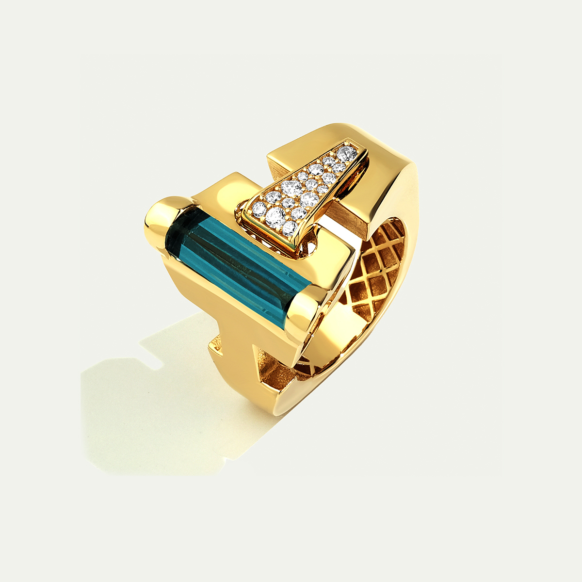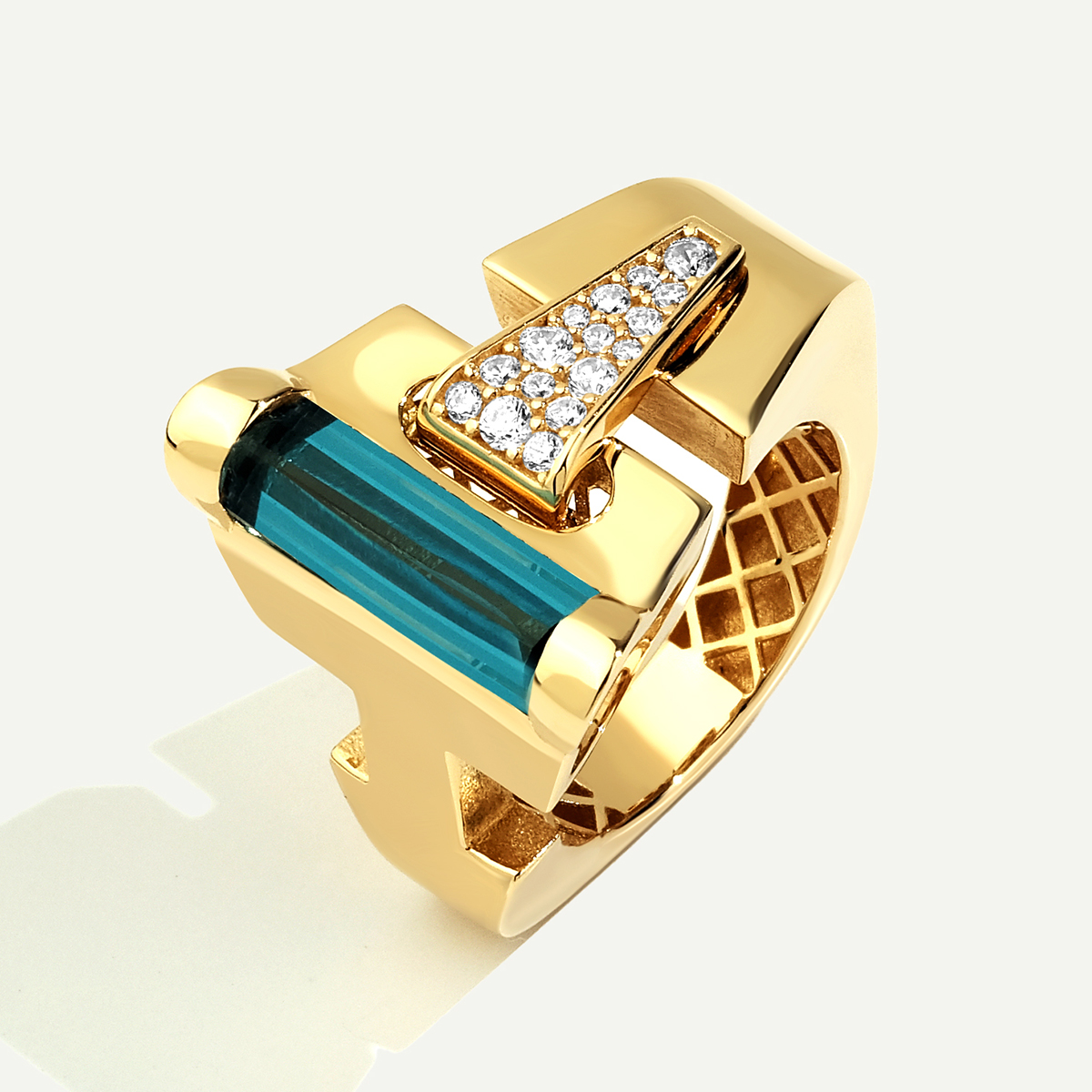 Modern çizgilere sahip Baget 14 Ayar Altın Mavi Taşlı Yüzük, cesur tasarımıyla güçlü bir duruş sergiler. Yüzüğün üst kısmında yer alan uzun mavi baget taş, geometrik hatlı altın formun içinde zarif bir vurgu oluşturur. Karşısında konumlanan küçük beyaz taşlı detay tasarıma parlak bir denge kazandırır. Farklı dokuların bir araya geldiği bu yüzük, modern estetiği ve sofistike ışıltıyı aynı anda yansıtır. Regold logolu özel kutusunda ve garanti belgesiyle sunulmaktadır.