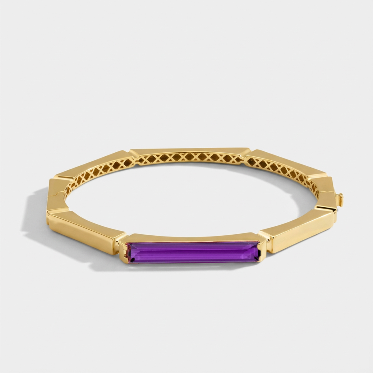 Canlı mor baget taşlarıyla süslenen Baget 14 Ayar Altın Mor Taşlı Kelepçe, geometrik ve modern tasarımıyla bileğinize iddialı ve göz alıcı bir dokunuş katıyor. Hem özel günlerde hem de günlük kullanıma uygun olan bu tasarım, stilinizin zarif tamamlayıcısı olur. Regold özel kutusunda ve garanti belgesiyle sunulmaktadır.