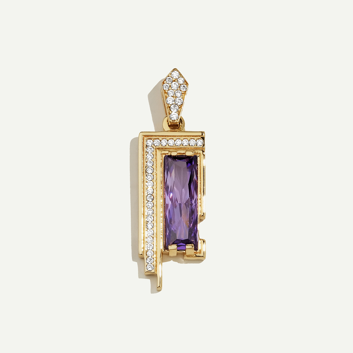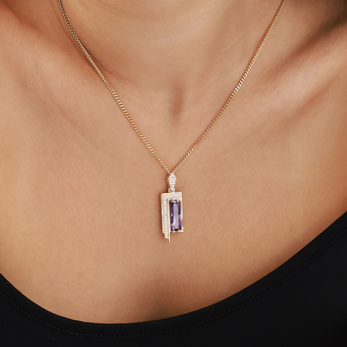 Merkezinde yer alan mor baget taşın zarif tonlarıyla öne çıkan Baget 14 Ayar Altın Mor Taşlı Kolye Ucu, etrafını saran küçük taşların ışıltısıyla dengeli bir bütünlük oluşturur. Geometrik hatlara sahip kolye ucu modern bir form sergilerken, mor taşın asaleti tasarıma sofistike bir karakter kazandırır. Göz alıcı ama sade görünümüyle hem günlük şıklığa hem de özel anlara uyum sağlar. Regold logolu özel kutusunda ve garanti belgesiyle sunulmaktadır.