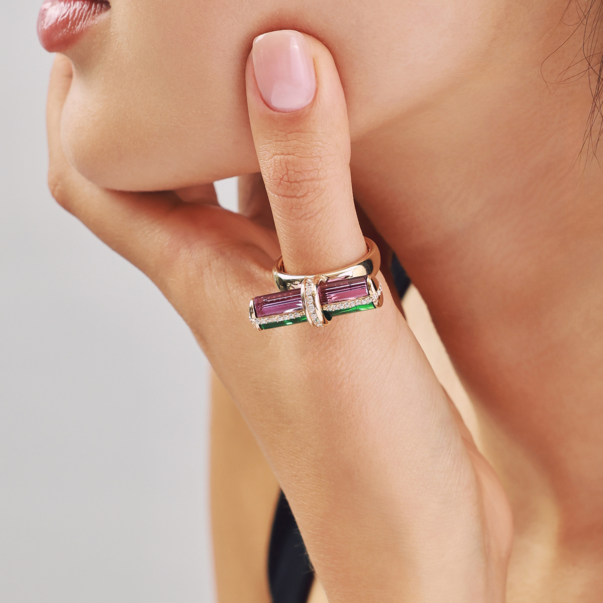 Baget 14 Ayar Altın Mor ve Yeşil Taşlı Yüzük