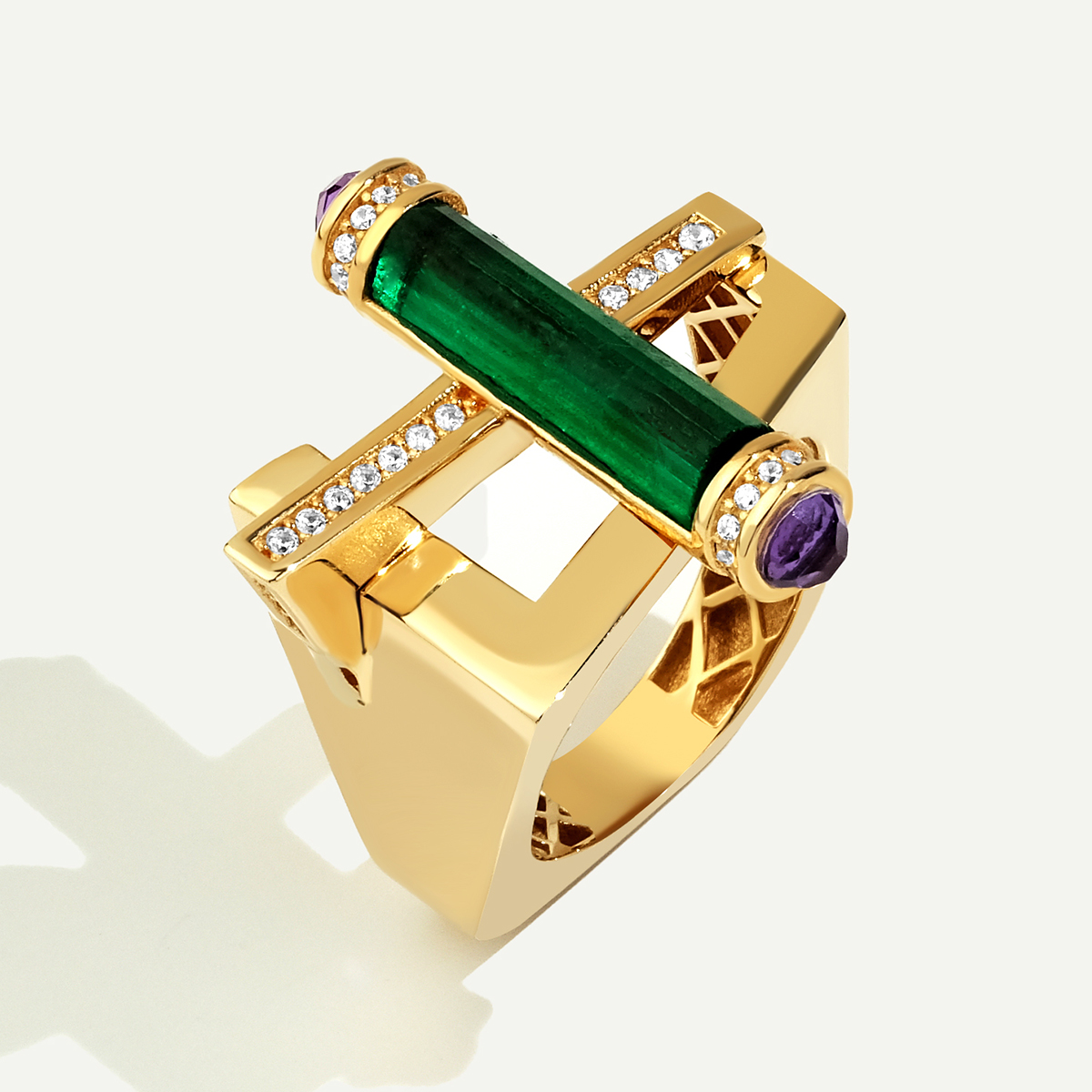 Baget 14 Ayar Altın Mor ve Yeşil Taşlı Yüzük