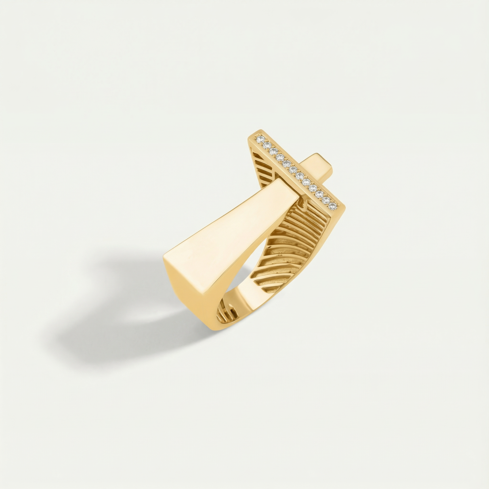 Geometrik formu ve parlak taş detaylarıyla dikkat çeken bu 14 ayar altın yüzük, modern takı anlayışını yeniden yorumluyor. Güçlü ve iddialı duruşuyla hem günlük hayatta hem de özel anlarda şıklığınızı ön plana çıkarır. Regold logolu özel kutusunda ve garanti belgesi ile sunulmaktadır.