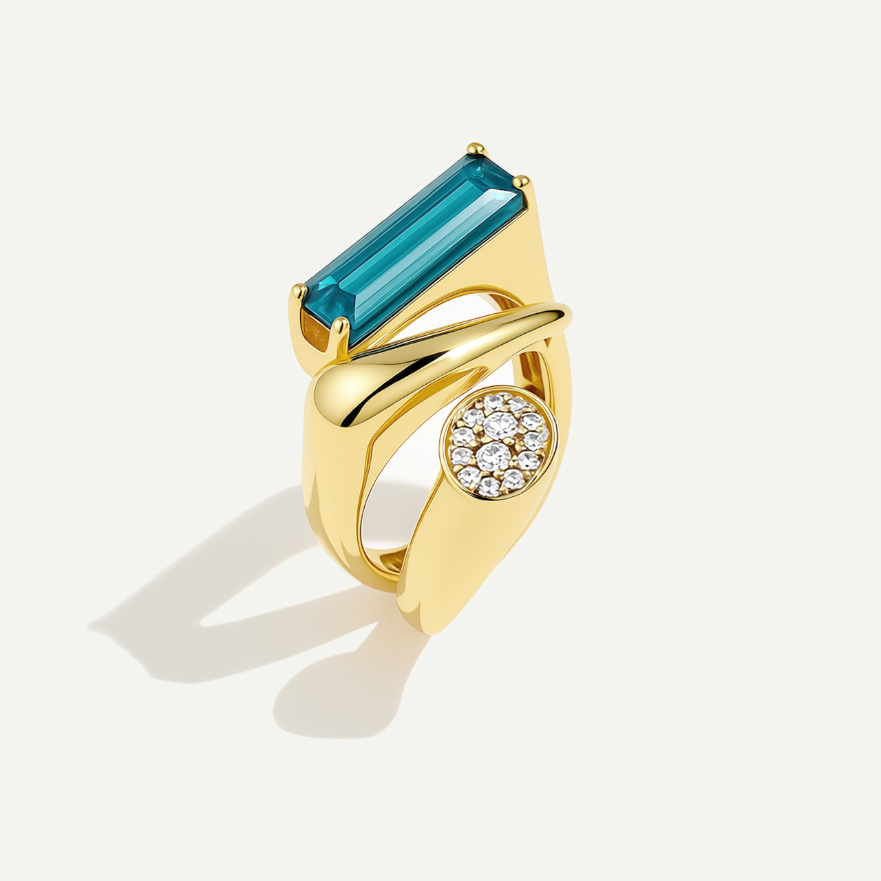 Modern çizgileriyle dikkat çeken Baget 14 Ayar Altın Üç Detaylı Mavi Taşlı Yüzük, üç parçalı formuyla zarif bir bütünlük sunuyor. Ortada yer alan mavi baget taş güçlü bir vurgu yaratırken iki yandaki küçük yuvarlak taşlar ışıltıyı zarifçe tamamlıyor. Parlak altın yüzey ve taşların rengi arasındaki uyum, bu tasarımı hem modern hem de feminen bir şıklığın simgesi haline getiriyor. Regold logolu özel kutusunda ve garanti belgesi ile sunulmaktadır.