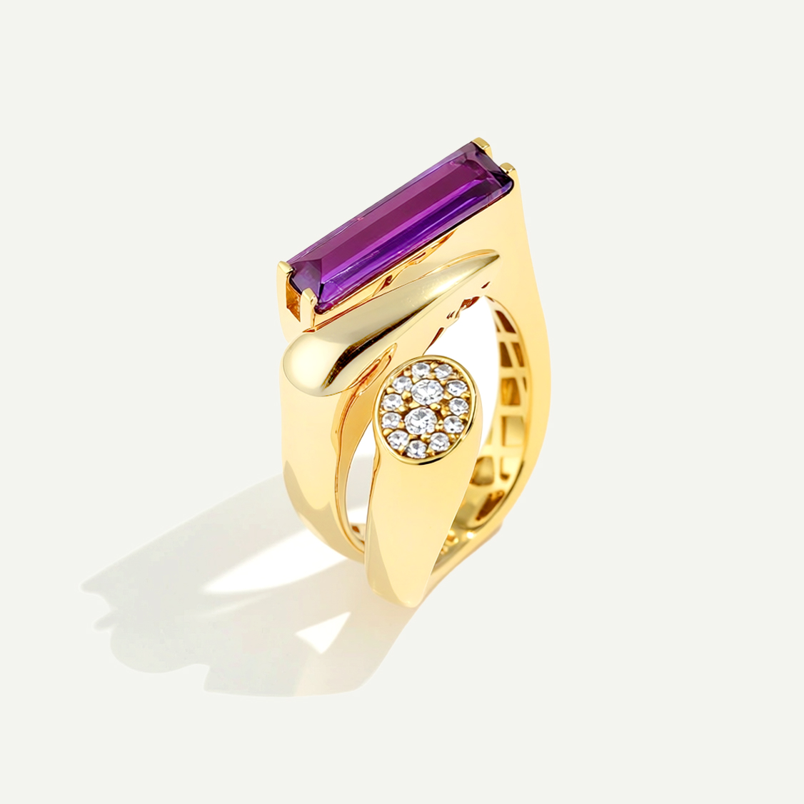 Baget 14 Ayar Altın Üç Detaylı Mor Taşlı Yüzük