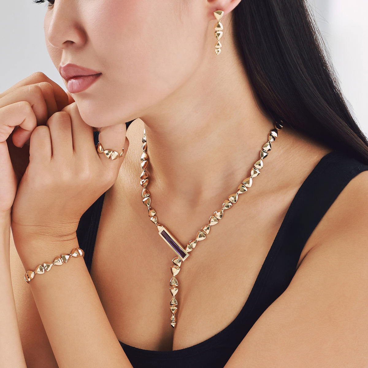 Bu özel set, kolye, küpe, bileklik ve yüzükten oluşan zarif bir tasarım bütünüdür. Baget 14 Ayar Altın Üçgen Detaylı Mor Taşlı Set, üçgen formdaki detaylarıyla modern bir çizgi sunarken mor baget taşlarla ışıltılı bir kontrast yaratır. Her parçada özenle yerleştirilen taşlar altının parlak tonuyla birleşerek asil ve dikkat çekici bir görünüm oluşturur. Işığı zarifçe yansıtan bu set, hem klasik hem çağdaş stillere kolayca uyum sağlayan güçlü bir şıklık sunar. Regold logolu özel kutusunda ve garanti belgesiyle sunulmaktadır.