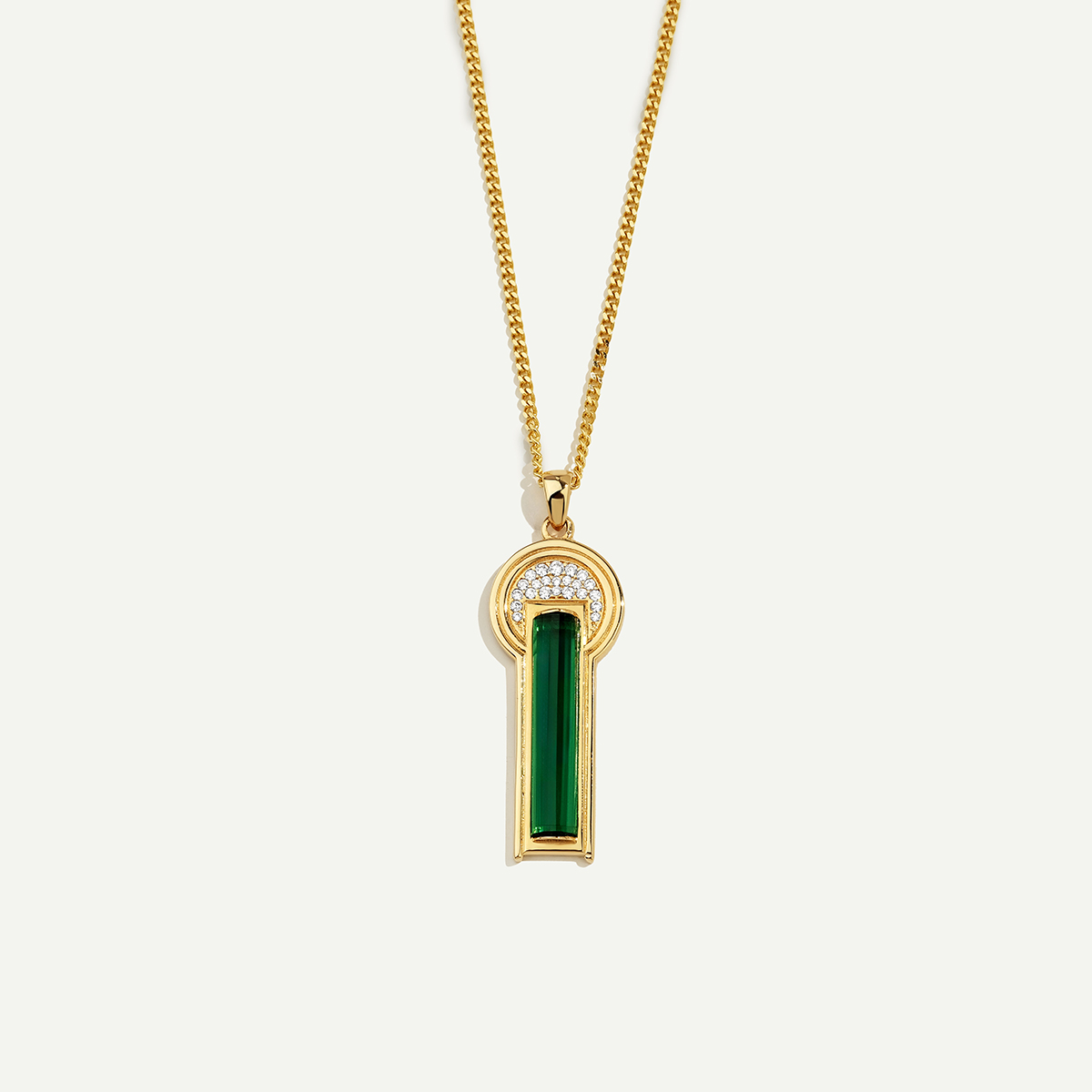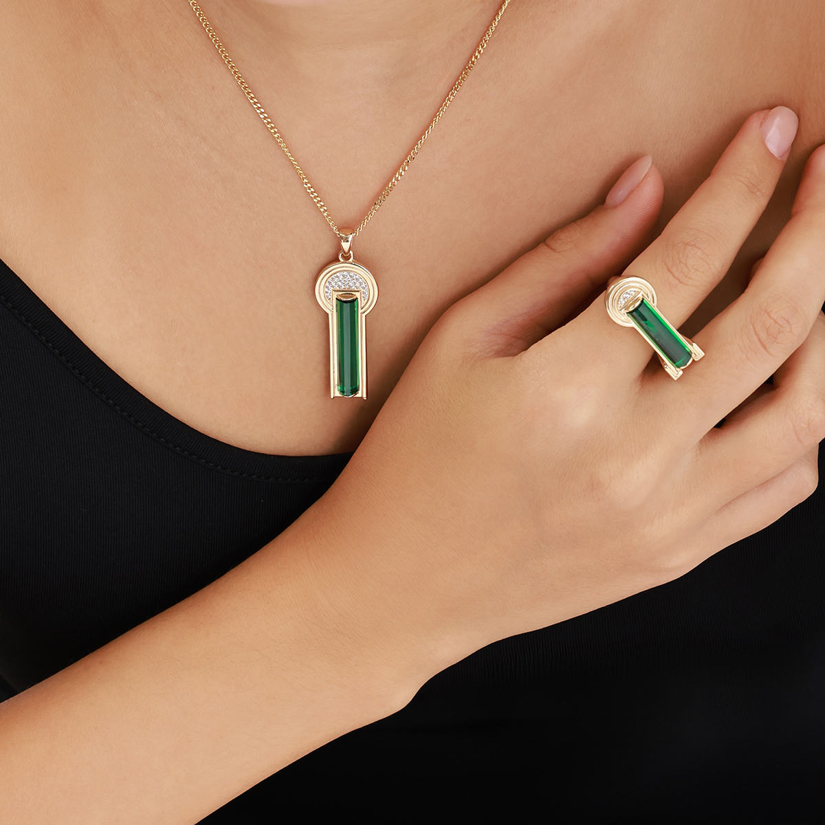 Zarif bir tasarıma sahip olan Baget 14 Ayar Altın Yeşil Taşlı Kolye, merkezinde yer alan uzun baget kesim yeşil taşla dikkat çekiyor. 14 ayar altından üretilen gurmet zincir, 45 cm uzunluğu ve 4 gram ağırlığıyla zarif bir duruş sunar. Taşın üst kısmını çevreleyen küçük beyaz taşlar kolyeye ince bir ışıltı kazandırırken altın çerçevesi bu parlaklığı zarif bir şekilde dengeliyor. Modern ve sade çizgileriyle bu kolye, her stile uyum sağlayan zamansız bir şıklık sunuyor. Regold logolu özel kutusunda ve garanti belgesiyle sunulmaktadır.