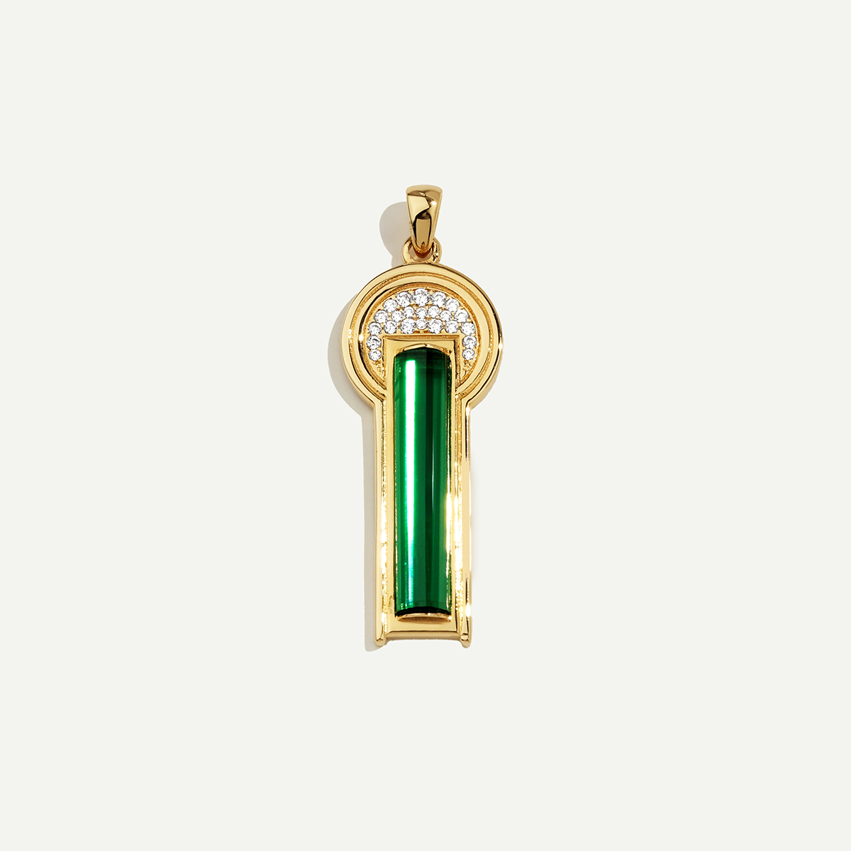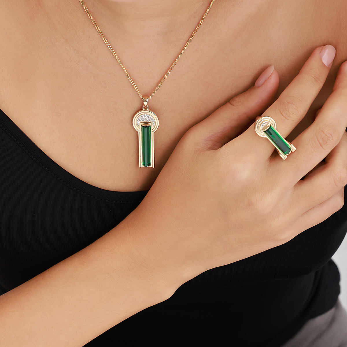 Zarif bir tasarıma sahip olan Baget 14 Ayar Altın Yeşil Taşlı Kolye Ucu, merkezinde yer alan uzun baget kesim yeşil taşla dikkat çekiyor. Taşın üst kısmını çevreleyen küçük beyaz taşlar kolye ucuna ince bir ışıltı kazandırırken altın çerçevesi bu parlaklığı zarif bir şekilde dengeliyor. Modern ve sade çizgileriyle bu kolye ucu, her stile uyum sağlayan zamansız bir şıklık sunuyor. Regold logolu özel kutusunda ve garanti belgesiyle sunulmaktadır.