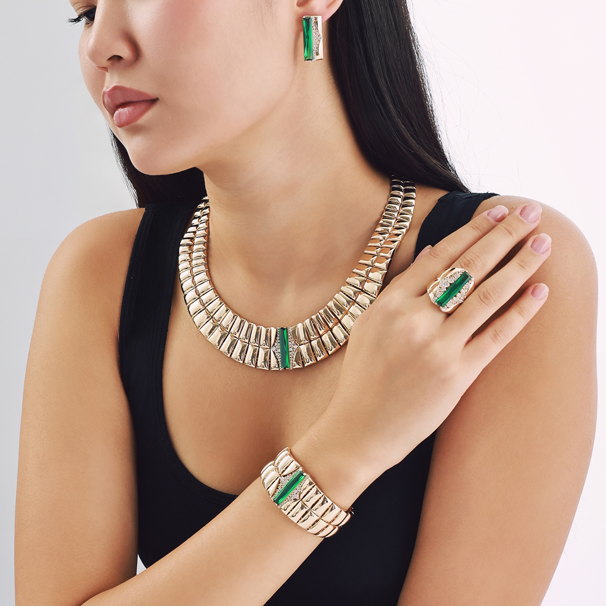 Baget 14 Ayar Altın Yeşil Taşlı Set, kolye, küpe, bileklik ve yüzükten oluşan zarif bir kombinasyon sunar. Bu set altının parlak tonunu yeşil baget taşların canlı ışıltısıyla buluşturur. Taşların kesimi ve dizilimi tasarıma modern bir çizgi kazandırırken altının sıcak rengiyle mükemmel bir denge oluşturur. Işıltısı ve zarif formuyla bu set hem özel davetlerde hem de günlük şıklıkta dikkat çekici bir duruş sağlar. Regold logolu özel kutusunda ve garanti belgesiyle sunulmaktadır.