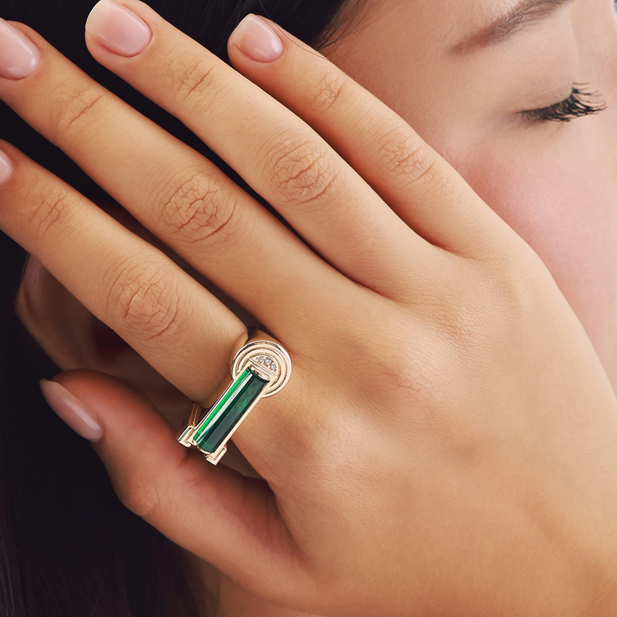 Çağdaş çizgilerle tasarlanan Baget 14 Ayar Altın Yeşil Taşlı Yüzük, uzun kesim yeşil taşın güçlü etkisini pırlanta detayların zarif ışıltısıyla buluşturuyor. Geometrik formu sayesinde modern bir karaktere sahip olan yüzük, hem günlük şıklıkta hem de özel davetlerde fark yaratır. Cesur tasarımıyla sofistike bir ifade sunar. Regold logolu özel kutusunda ve garanti belgesi ile sunulmaktadır.