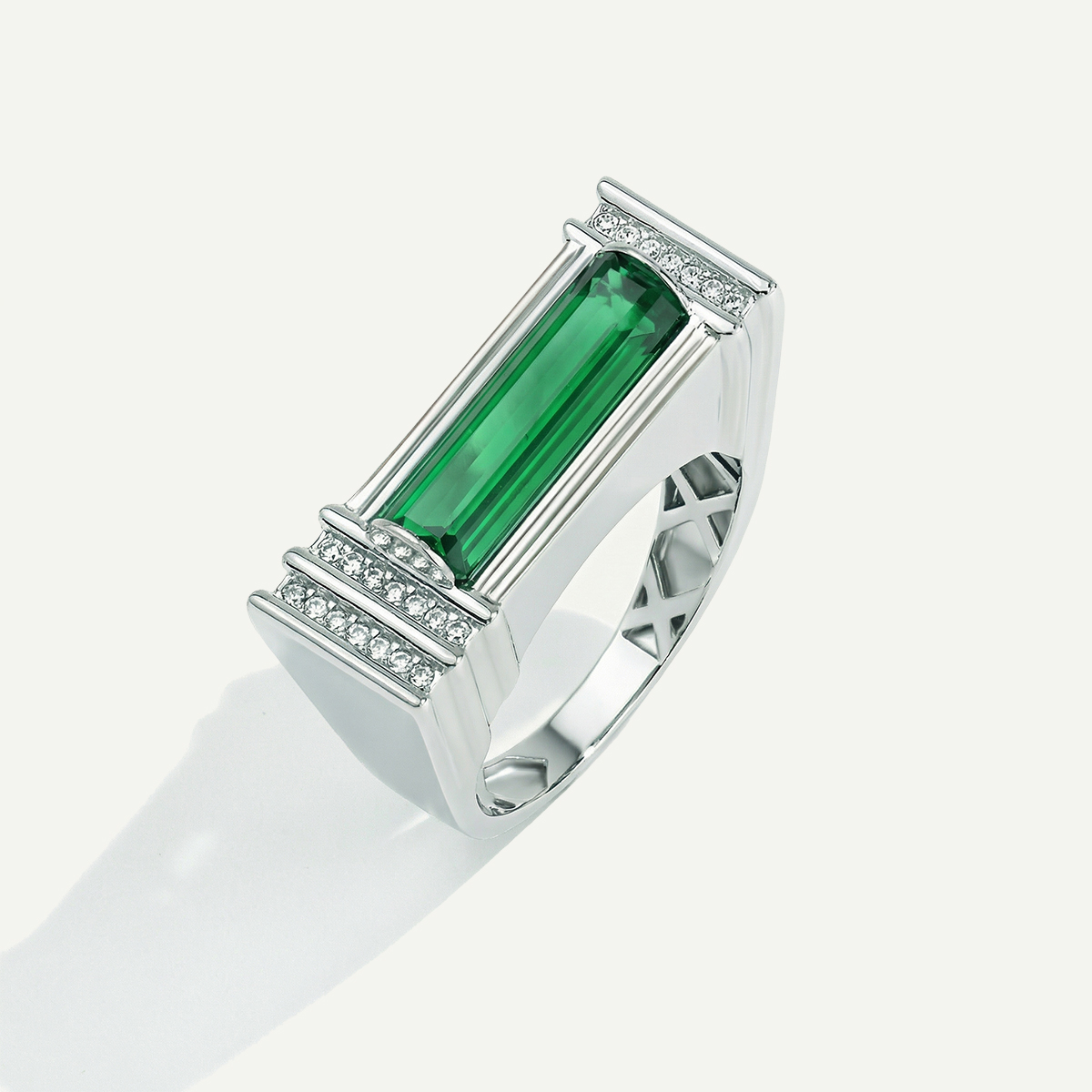 Baget 14 Ayar Beyaz Altın Yeşil Taşlı Yüzük