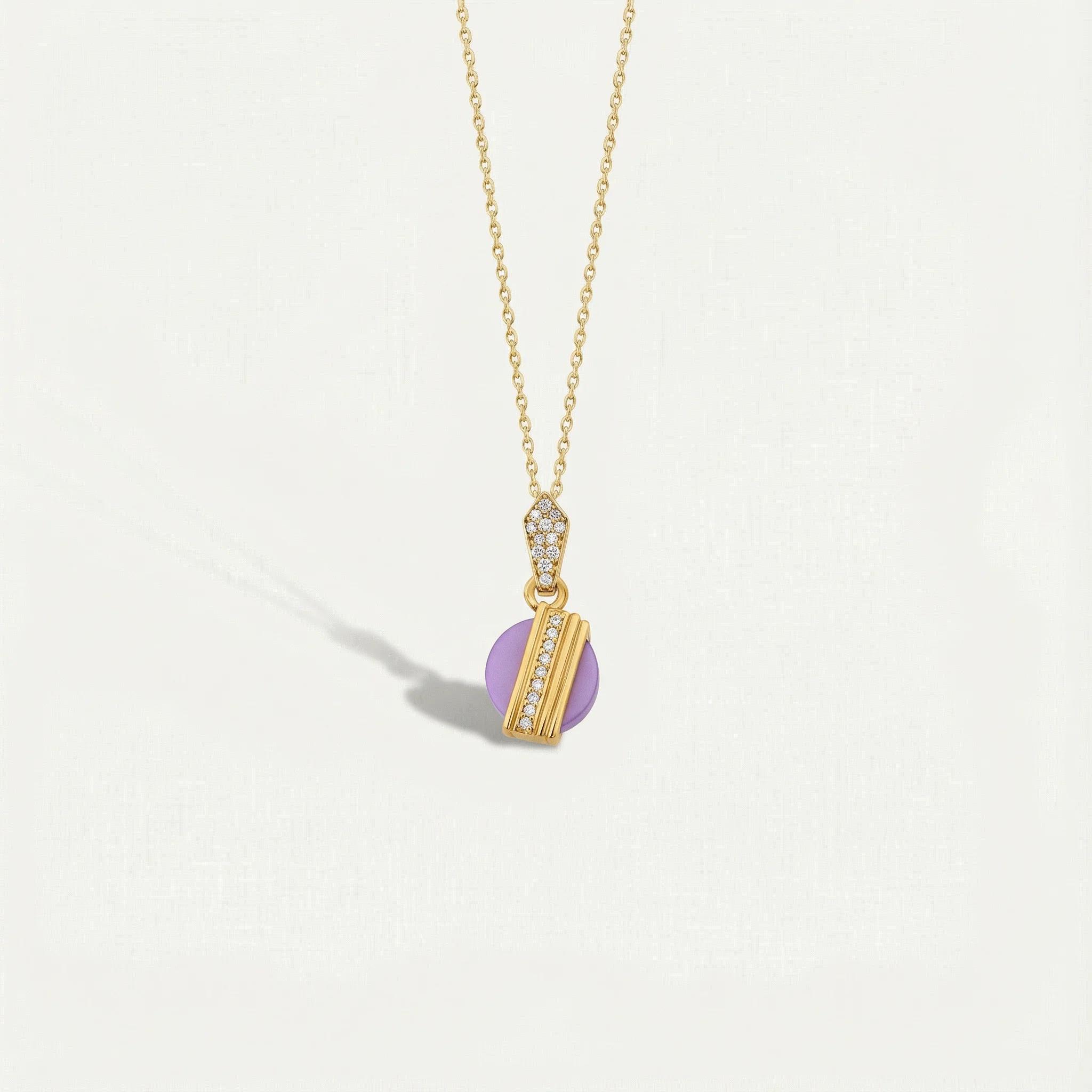 Ortası lila tonlarında bir taşla zarifçe vurgulanan bu Bonbon 14 Ayar Altın Lila Taşlı Kolye, taşın üst kısmında yer alan küçük ve zarif detaylarla birlikte geometrik bir estetik yakalıyor. Parlak altın zinciri ve nazikçe şekillendirilmiş plaka formu kolyeye dengeli bir duruş kazandırırken taşın yumuşak rengi tasarıma romantik bir hava katıyor. Hem günlük kombinlerde hafif bir ışıltı sunuyor hem de özel günlerde zarif bir tamamlayıcı olarak öne çıkıyor. Regold logolu özel kutusunda ve garanti belgesiyle sunulmaktadır.