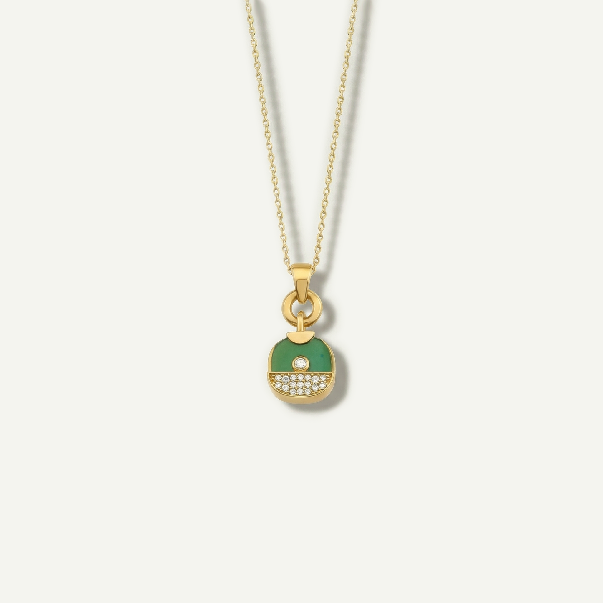 Bonbon 14 Ayar Altın Yeşil Taşlı Kolye, 14 ayar altının zarif ışığı üzerinde yeşil baget taşın canlı rengiyle öne çıkıyor. Taş stratejik bir şekilde kolye ucunda yükseliyor ve formuyla modern bir vurgu yapıyor. Altının parlak yüzeyi taşın derin tonunu daha da belirginleştiriyor ve kolye her hareketle ince bir ışıltı yayarak dikkat çekici bir aksesuar haline geliyor.Regold logolu özel kutusunda ve garanti belgesiyle sunulmaktadır.