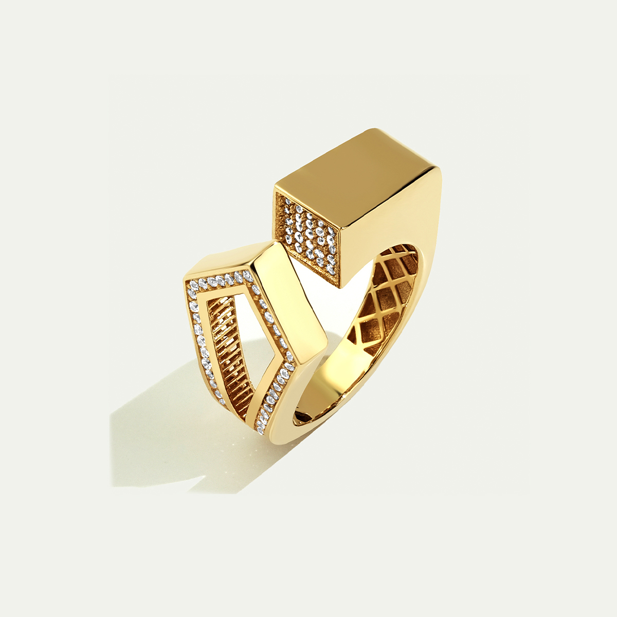 Bu göz alıcı tasarım, Electra 14 Ayar Altın Geometrik Formlu Taşlı Yüzük adıyla, modern ve heykelsi formuyla tüm dikkatleri üzerinize çeker. Altından üretilen bu açık yüzük, iki cesur geometrik şekilden oluşur. Dikdörtgen blok formunun ucu tamamen parıltılı taşlarla kaplanmışken, diğer uçtaki V şekilli form kenarlarından taşlarla çevrelenerek merkezdeki özel çizgili detayla tasarıma derinlik katar. Geniş bandının iç yüzeyindeki lüks petek deseniyle işçilik kalitesini vurgulayan bu model, stilinize güçlü ve sanatsal bir imza atar. Regold logolu özel kutusunda ve garanti belgesi ile sunulmaktadır.