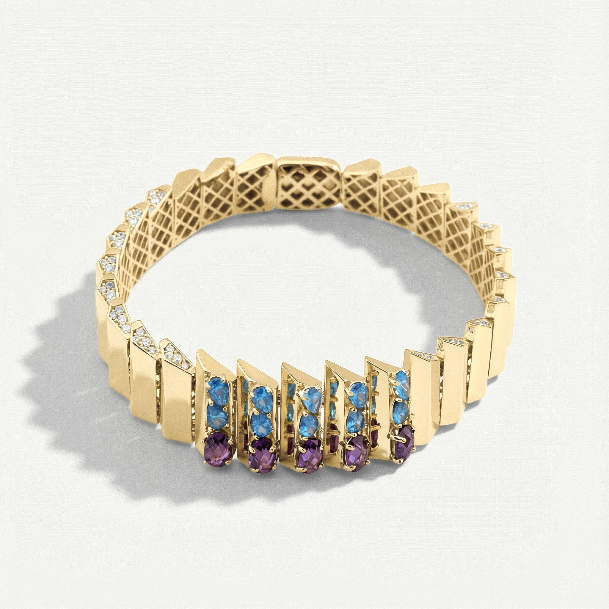 Zarif detaylarıyla öne çıkan Electra 14 Ayar Altın Mavi ve Mor Taşlı Set, kolye, bileklik, küpe ve yüzükten oluşan bütünlüklü bir tasarım sunar. Set boyunca tekrarlanan mavi ve mor taşlar birbirini tamamlayan renk geçişleriyle dikkat çekerken, parlak altın dokusu bu tonların ışıltısını vurgular. Kolye zarif formuyla boyun hattını aydınlatırken, küpe ve yüzükteki taş yerleşimleri tasarıma modern bir denge kazandırır. Bileklik ise mavi taş dizilimiyle setteki renk armonisini tamamlar ve her bir parça birlikte kullanıldığında kusursuz bir zarafet ortaya çıkarır. Regold logolu özel kutusunda ve garanti belgesiyle sunulmaktadır.