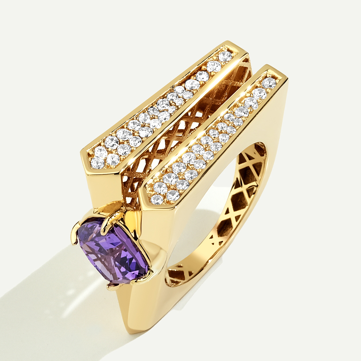 Bu zarif tasarım, Electra 14 Ayar Altın Mor Taşlı Yüzük, modern mimari çizgilerle lüks detayları bir araya getiriyor. Ortasında yer alan göz alıcı mor taş, altın tonuyla mükemmel bir kontrast oluştururken yüzüğün iki kenarına dizilen küçük parlak taşlar tasarıma güçlü bir simetri katıyor. İç kısmındaki kafes formundaki işçilik, yüzüğün hafifliğini korurken estetik bir derinlik yaratıyor. Cesur formu ve sofistike detaylarıyla bu yüzük hem çağdaş hem zamansız bir şıklığın ifadesi oluyor. Regold logolu özel kutusunda ve garanti belgesi ile sunulmaktadır.