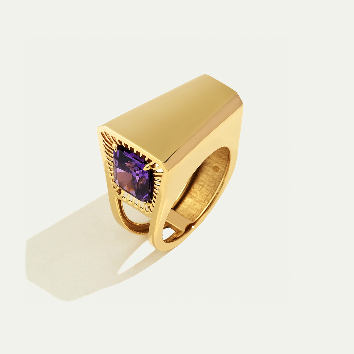 Merkezinde zarif mor taşla dikkat çeken Electra 14 Ayar Altın Mor Taşlı Yüzük, taşın derin tonuyla altın gövdesi arasında sofistike bir kontrast yaratır. Işığı yansıtan parlak yüzeyiyle tasarım hem tek başına dikkat çeker hem de diğer takılarla birlikte kombinlerde dengeli bir ışıltı sunar. Geometrik formlarla şekillendirilmiş detaylar yüzüğe modern bir karakter kazandırırken sade ama iddialı duruşuyla günlük kombinlerden özel anlara kadar geniş kullanım alanı sunar. Regold logolu özel kutusunda ve garanti belgesi ile sunulmaktadır.