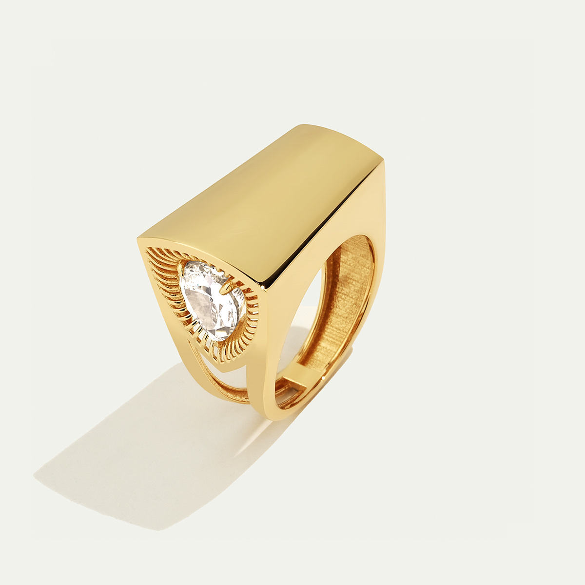 Üçgen formdaki büyük taşıyla dikkat çeken Electra 14 Ayar Altın Taşlı Yüzük, keskin hatlarıyla modern ve iddialı bir görünüm sunar. Taşın büyüklüğü parlak altın yüzey üzerinde zarif bir kontrast oluştururken geometrik form tasarıma güçlü bir karakter kazandırır. Işığı farklı açılardan yansıtan yüzey yapısı sayesinde yüzük hem günlük kombinlerde enerjik bir dokunuş sağlar hem de özel davetlerde sofistike bir şıklık yaratır. Regold logolu özel kutusunda ve garanti belgesi ile sunulmaktadır.