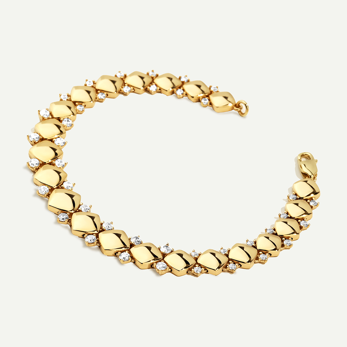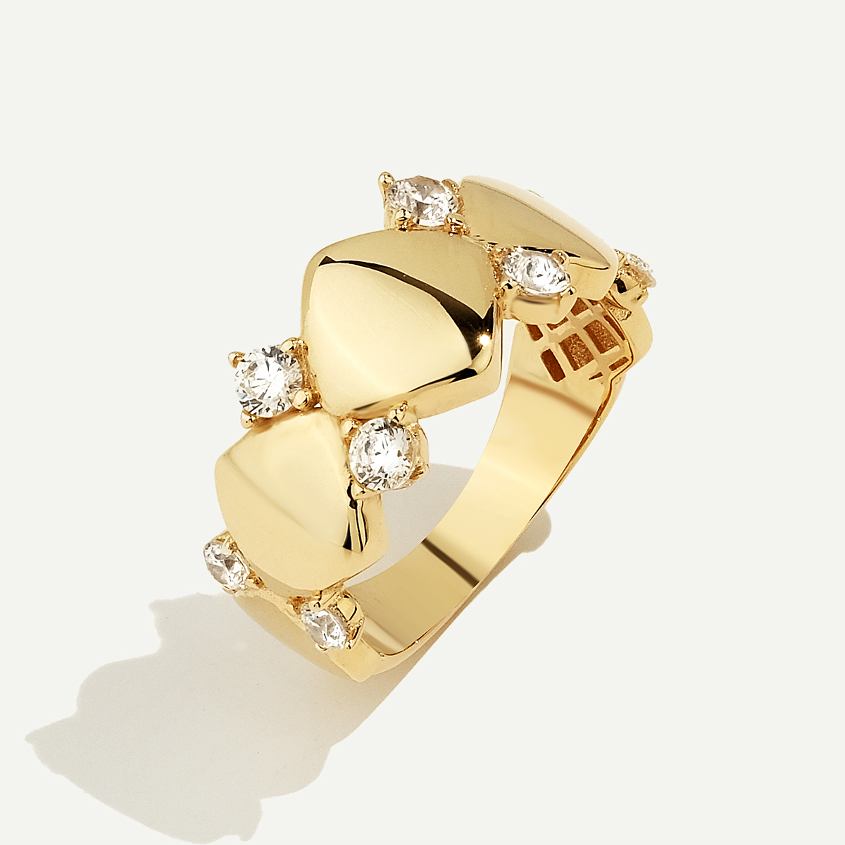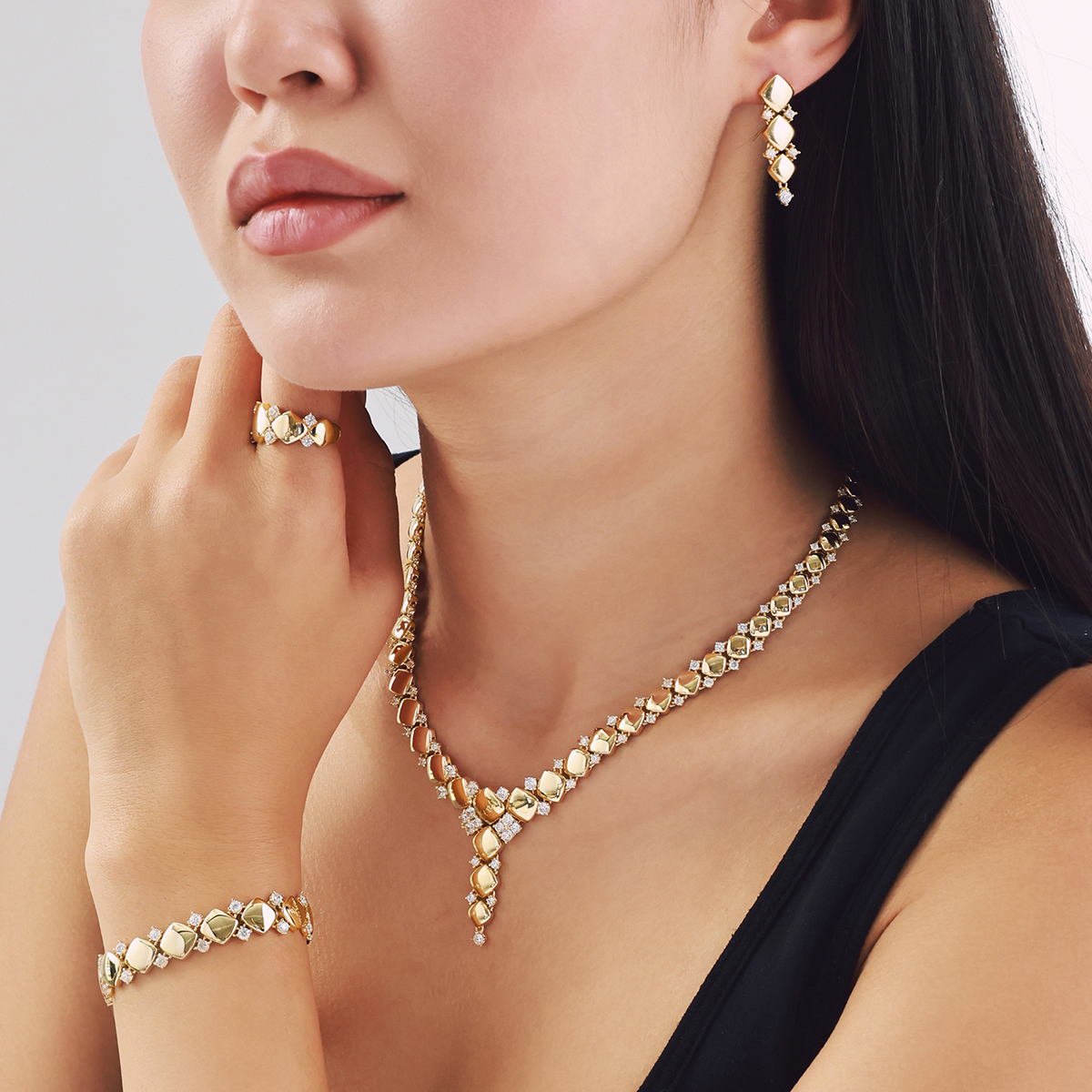 Eta 14 Ayar Altın Geometrik Formlu Taşlı Set kolye, küpe, bileklik ve yüzük parçalarından oluşuyor ve geometrik form detaylarıyla dikkat çekiyor. 14 ayar altının parlak yüzeyi taşların ışıltısıyla buluşarak cesur ama zarif bir ifade yaratıyor. Her parça keskin hatlarla tanımlanmış formuna rağmen birleştiğinde akıcı ve dengeli bir şıklık sunuyor. Set günlük kullanımlardan özel gecelere kadar her stilde güçlü bir vurgu oluşturuyor. Regold logolu özel kutusunda ve garanti belgesiyle sunulmaktadır.