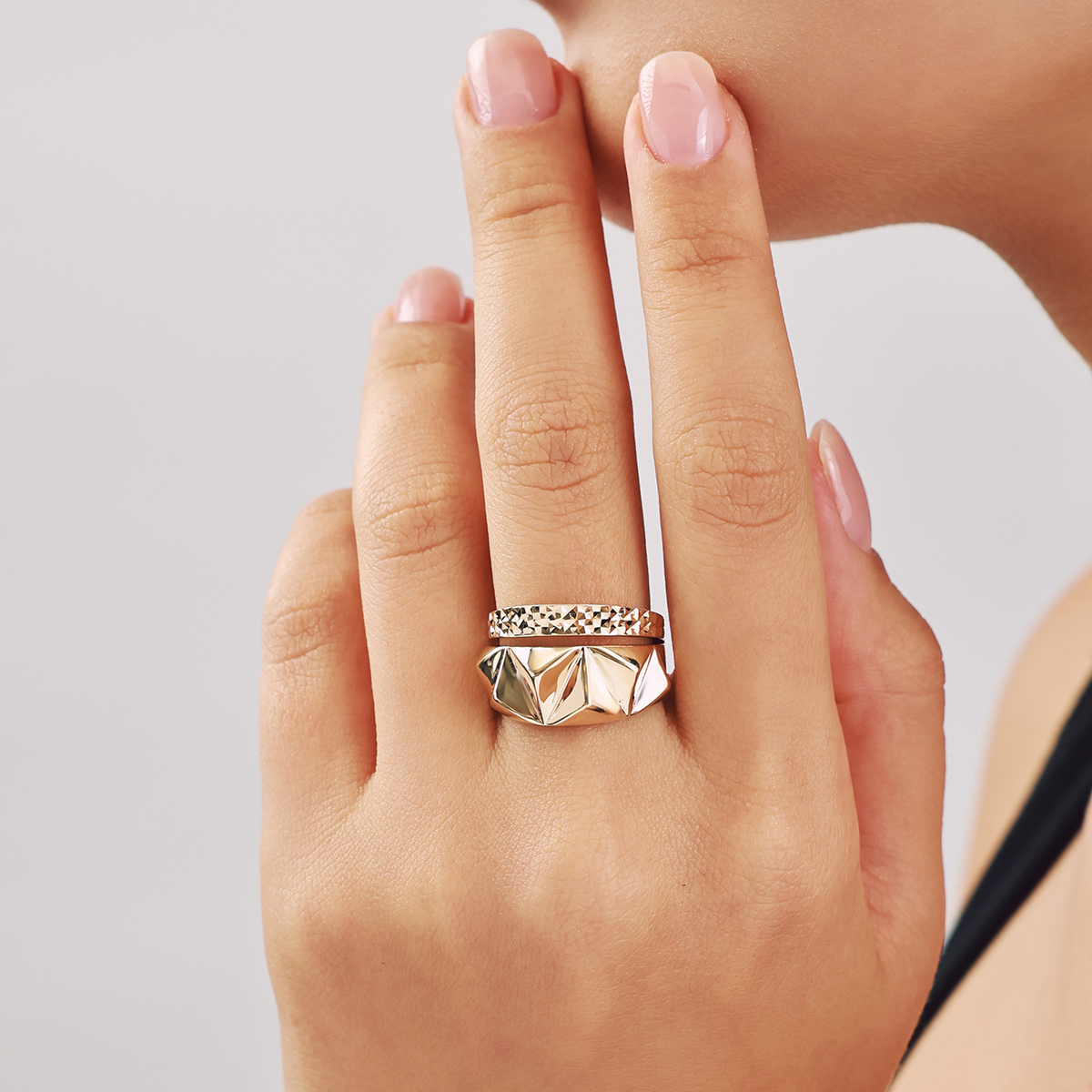 Modern çizgileriyle öne çıkan bu 14 ayar altın yüzük, geometrik yüzey tasarımıyla güçlü bir duruş sergilerken, yanındaki dokulu bant detayıyla şıklığını tamamlar. Parlak ve mat efektlerin birleşimi yüzüğe dinamik bir görünüm kazandırır. Hem günlük kombinlerde fark yaratan bir parça olarak hem de özel davetlerde iddialı bir aksesuar olarak kullanılabilir.