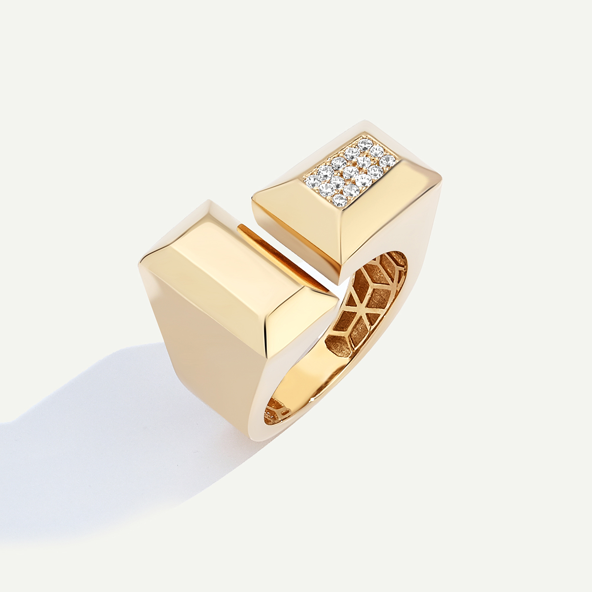 14 Ayar Altın Yüzük, geometrik ve güçlü tasarımıyla modern bir ifade sunar. İki blok formun ortasında yer alan küçük taş detayları yüzüğe zarif bir ışıltı katarken, heykelsi hatları ile özgün bir stil oluşturur. Günlük şıklığa dinamizm katmak veya özel günlerde iddialı bir görünüm yaratmak için ideal. Regold logolu özel kutusunda ve garanti belgesiyle sunulmaktadır.