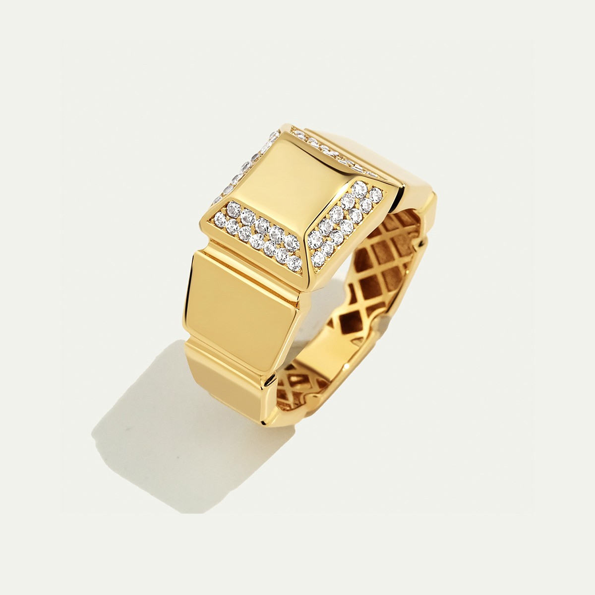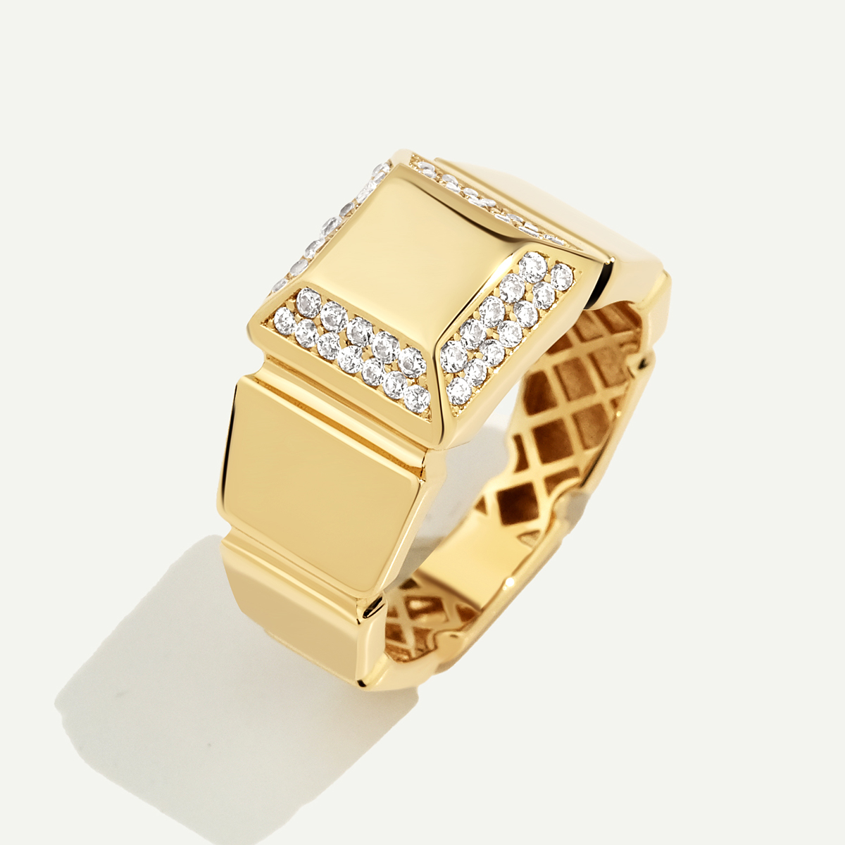 Kare formuyla geometrik bir karakter taşıyan Eta 14 Ayar Altın Kare Formlu Taşlı Yüzük, yüzeyine serpiştirilmiş taş detaylarıyla modern ve ışıltılı bir dokunuş sunar. Taşların düzeni yüzüğe dengeli bir parlaklık kazandırırken altın gövdesinin düz hatları bu ışıltıyı vurgular. Bu şık tasarım hem günlük kullanımlarda zarif bir aksesuar olur hem de özel anlarda stilinizi tamamlayan dikkat çekici bir parça haline gelir. Regold logolu özel kutusunda ve garanti belgesiyle sunulmaktadır.