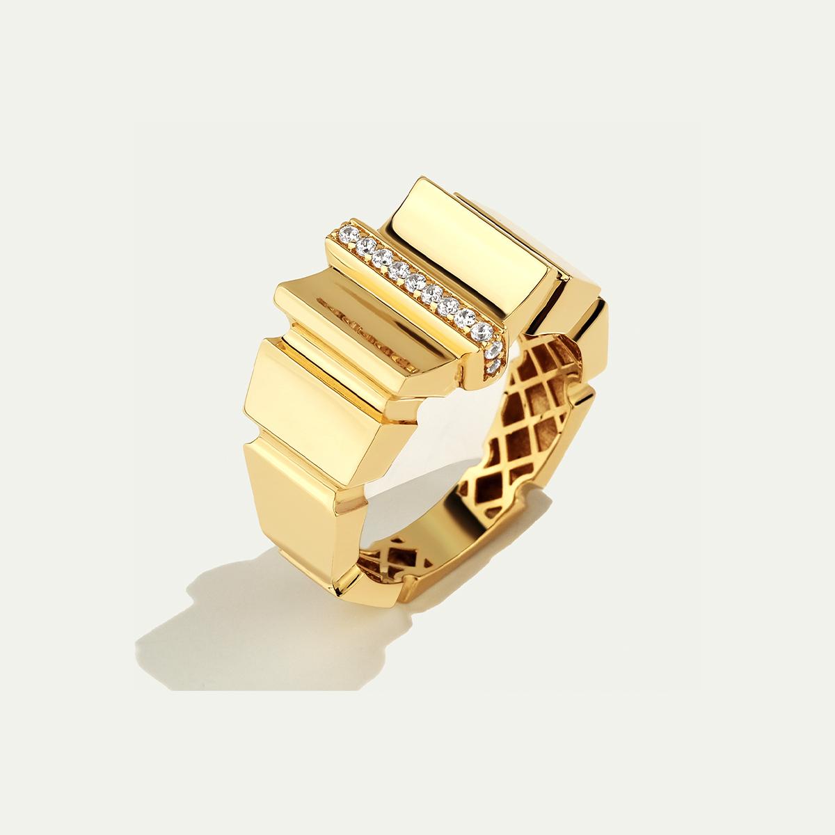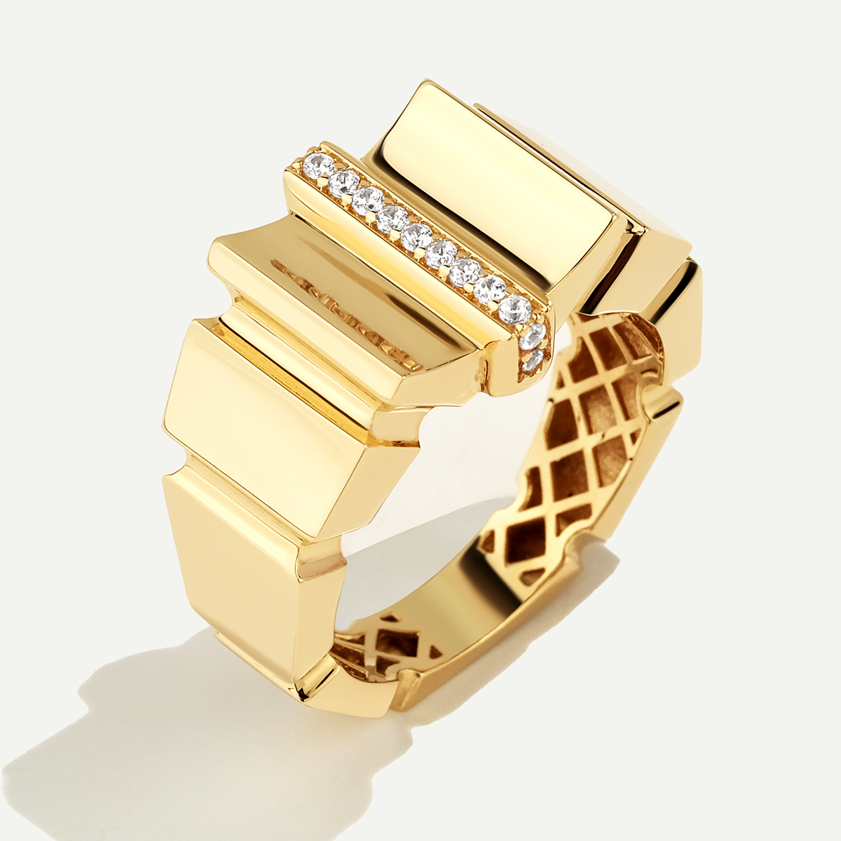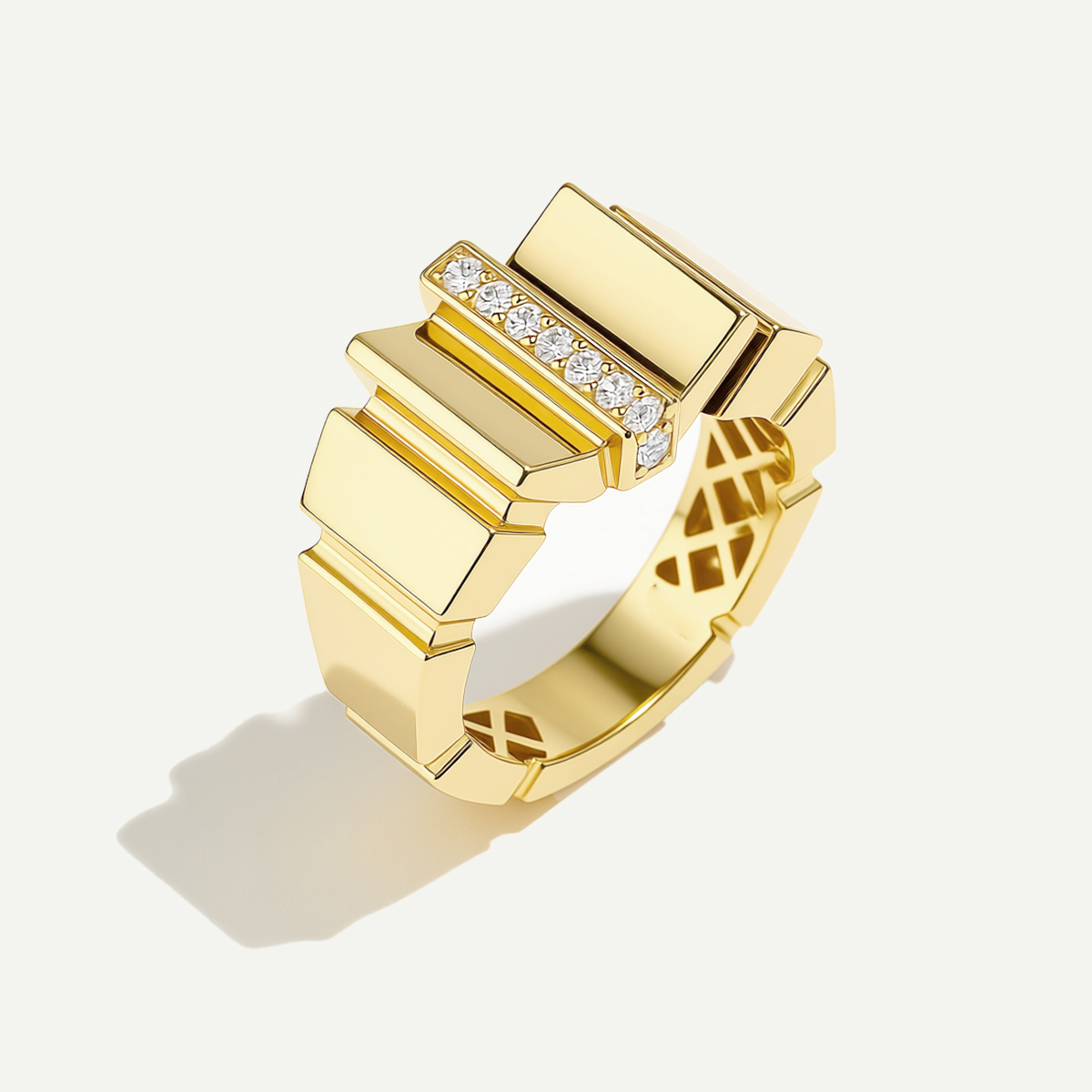 Özgün ve modern bir görünüm sunan bu 14 ayar altın yüzük, pırlanta görünümlü taş detayları ile şıklığı artırıyor. Cesur formu, sıra dışı bir tarz arayanlar için mükemmel bir seçimdir.