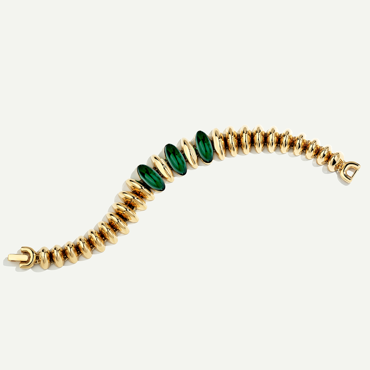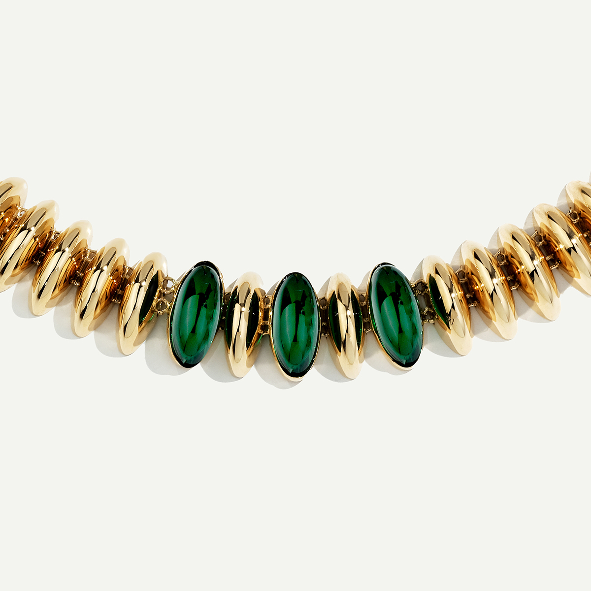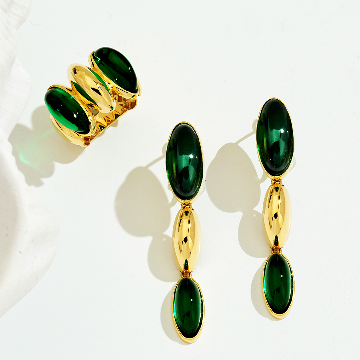 Eta 14 Ayar Altın Malahit Taşlı Set, kolye, küpe, yüzük ve bileklikten oluşur ve üçer sıralanmış malahit taş dizilimi ile dikkat çeker. Kolye ve bileklikte altın yüzey üzerinde üç adet eşit büyüklükte parlak yeşil malahit taş yan yana konumlandırılmıştır. Bu simetrik taş düzeni tasarıma ritmik bir ışıltı katarken altının sıcak tonu ile doğal taşın derin yeşil rengi birbirini dengeler. Modern formda tasarlanmış set, taşların canlılığı ve altının zarafeti birleşerek stilinize sofistike bir dokunuş sağlar. Regold logolu özel kutusunda ve garanti belgesiyle sunulmaktadır.