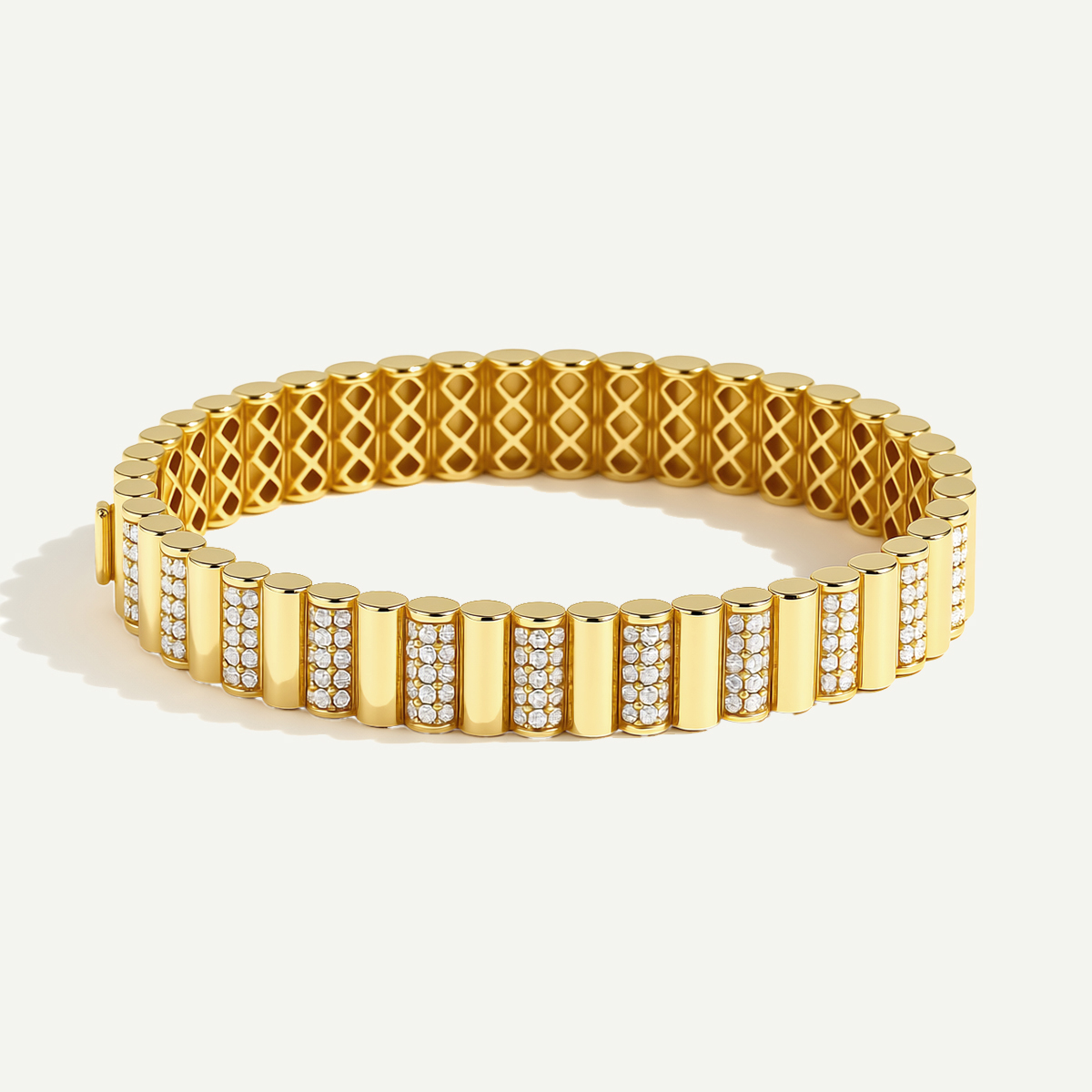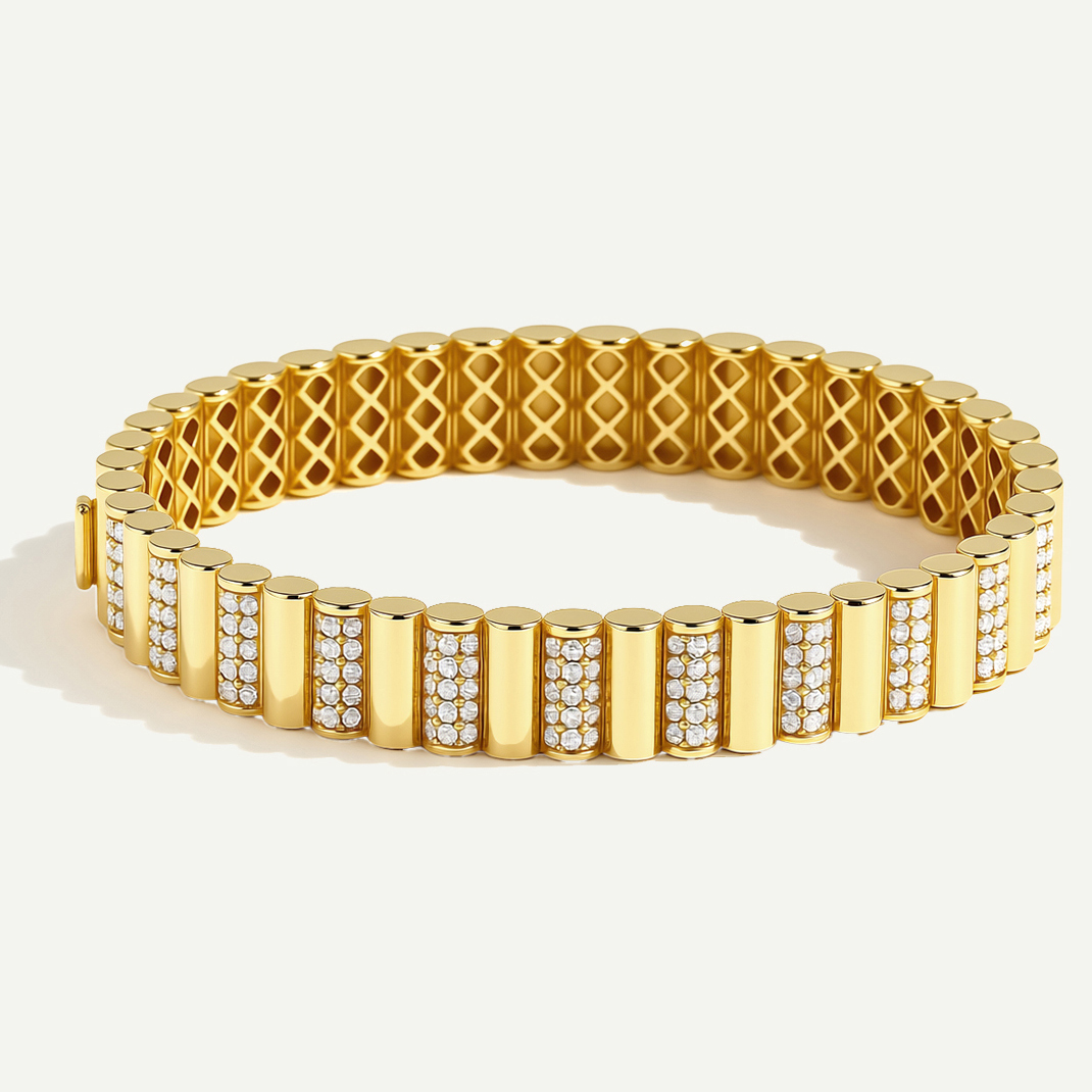 Gösterişin en zarif haliyle dikkat çeken bir tasarıma sahip olan 14 Ayar Altın Sıralı Dikdörtgen Taşlı Kelepçe, parlak altın yüzeyin üzerine işlenmiş taşların ışıltısıyla dikkatleri üstüne çekiyor. Sıralanmış parlak altın yüzey ve göz alıcı taşlarla hem davetlerde hem de günlük yaşantınızda kombininizin öncü parçası olmaya hazır.