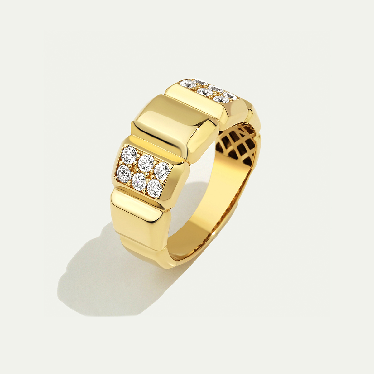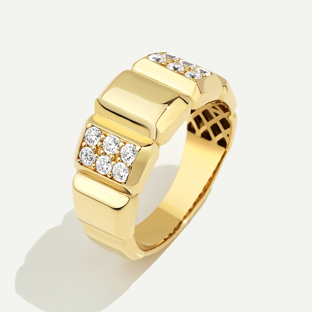 Eta koleksiyonunun özel tasarımlarından olan Eta 14 Ayar Altın Taşlı Yüzük, dikdörtgen formu ve üzerindeki taş detaylarıyla göz kamaştırıyor. Güçlü formu ve parlak taşları, modern ve sofistike bir stil yaratır. Regold logolu özel kutusunda ve garanti belgesiyle sunulmaktadır.