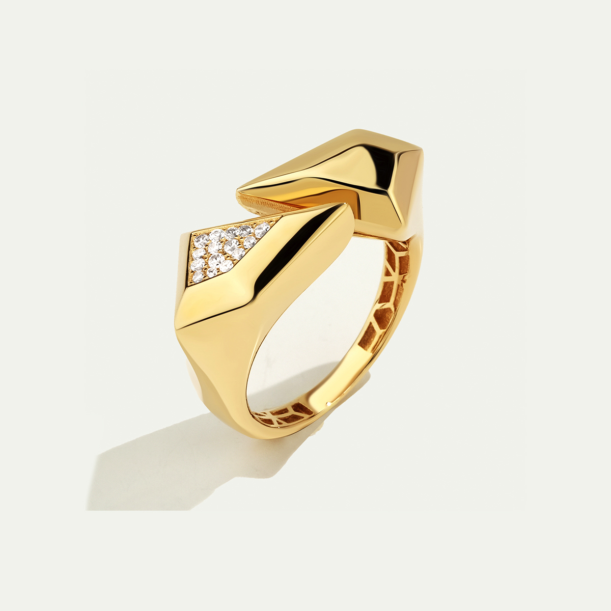 Eta koleksiyonunun en zarif üyelerinden biri olan Eta 14 Ayar Altın Taşlı Yüzük, geometrik formuyla modern ve güçlü bir duruş sergiliyor. Üst kısmındaki taşlarla süslenmiş üçgen detay, yüzüğün altın gövdesiyle kusursuz bir uyum sağlıyor. Işığı her açıdan yakalayan parlaklığı sayesinde özel anlarda fark edilmenizi sağlayacak bu tasarım, minimal dokunuşları sevenler için ideal. Hem şık bir aksesuar hem de modern bir sanat objesi niteliği taşıyan yüzük, Regold’un özgün tasarım anlayışının bir yansımasıdır. Regold logolu özel kutusunda ve garanti belgesi ile sunulmaktadır.