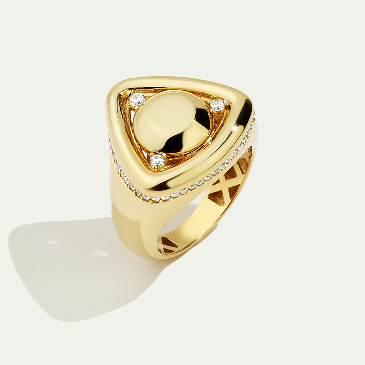 Geometrik tasarımıyla fark yaratan bu 14 ayar altın yüzük, üçgen formu ve parlak süs taşlarıyla modern bir görünüm sunar. Orta bölümdeki bombeli detay güçlü bir duruş sergilerken, kenarlardaki taşlar zarif bir ışıltı katar. Günlük kombinlerde farklılık yaratmak isteyenler için ideal olan bu tasarım, özel davetlerde de dikkat çekici bir aksesuar olarak öne çıkar. Altının sıcak tonuyla taşların parıltısı birleşerek sofistike bir şıklık sunar.