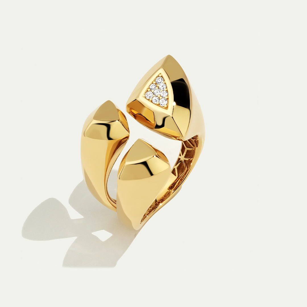 14 Ayar Altın Yüzük, modern ve güçlü tasarımıyla dikkat çeker. Üçgen formdaki detayında yer alan küçük taşlar yüzüğe zarif bir ışıltı katarken, açık formu sayesinde parmağa şık ve rahat bir oturuş sağlar. Minimal çizgileriyle hem günlük kullanımda hem de özel günlerde stilinizi tamamlayacak bir parçadır.
