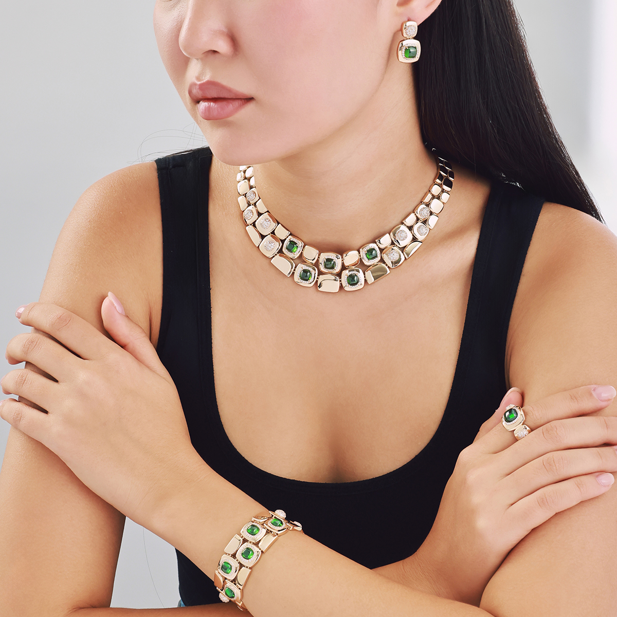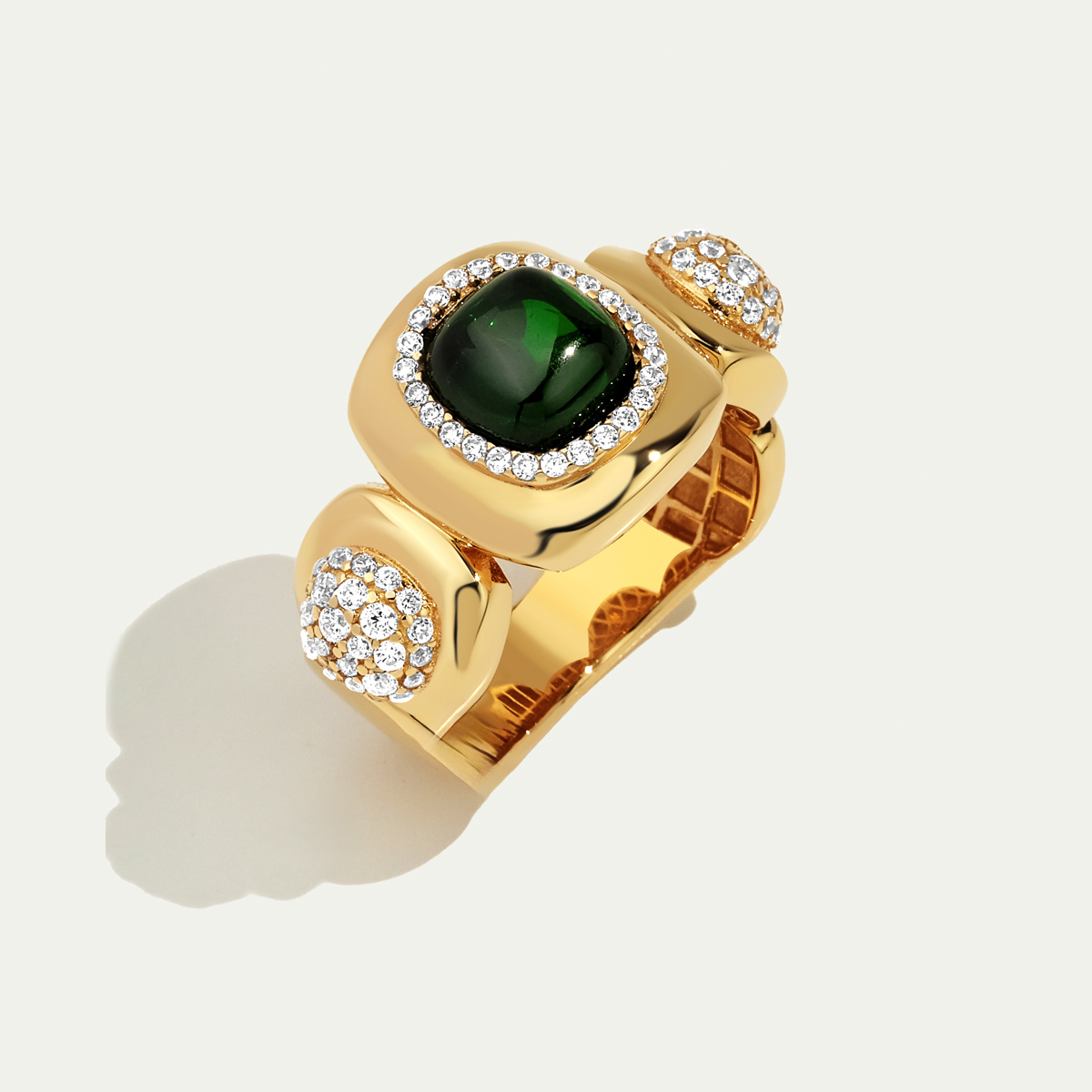Doğanın en derin tonlarından biri olan yeşil, 14 ayar altının sıcak ışıltısıyla buluşuyor. Ortadaki koyu yeşil taş, gücü ve dengeyi simgelerken çevresindeki parıltılar yüzüğe sofistike bir ihtişam katıyor. Yan taraflardaki taşlı detaylar ise tasarımın bütünlüğünü vurguluyor.