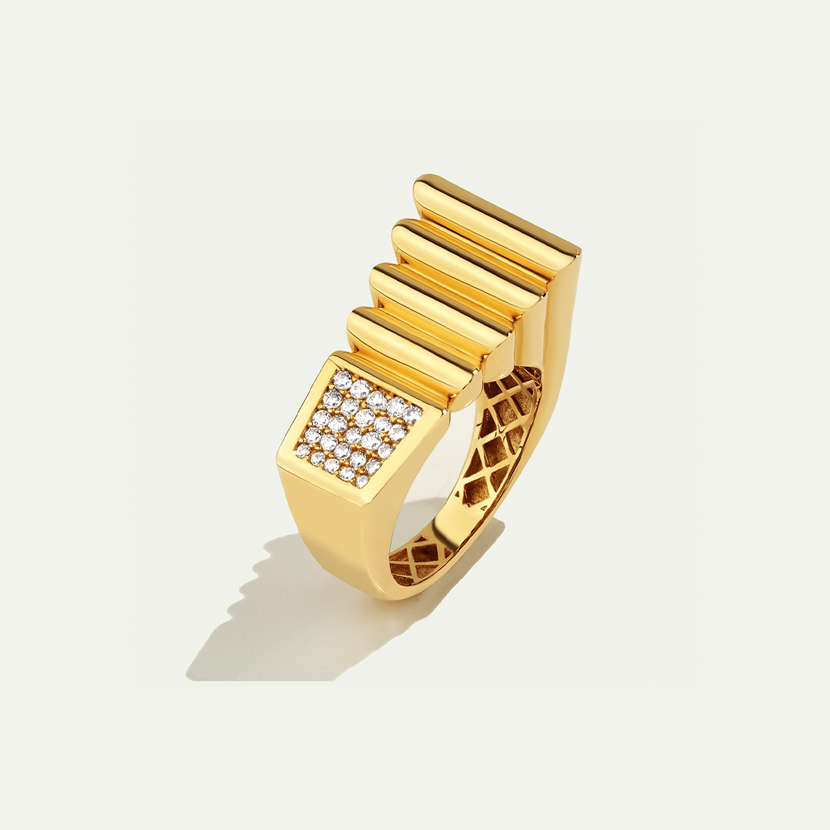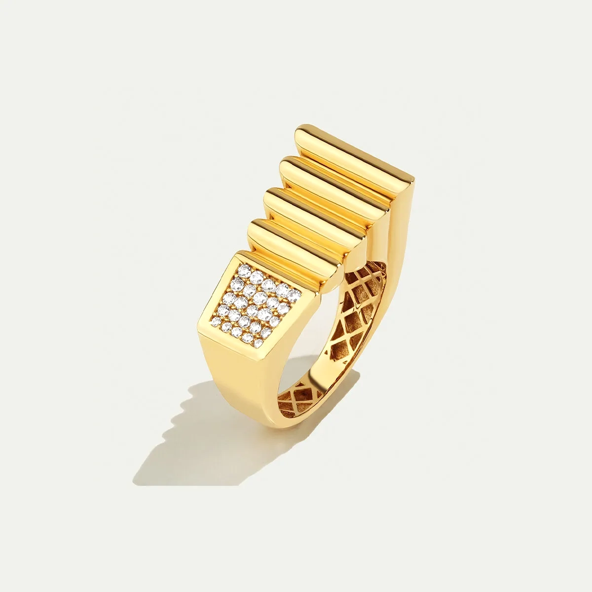 Alışılagelmiş yüzük tasarımlarının dışında bir parça olan Maya 14 Ayar Altın Özel Tasarım Yüzük, dikkat çekici ve cesur bir parçadır. Yüzeydeki yan yana dizilmiş parçaların illüzyonu adeta mimari bir etki yaratır.Tasarım, merkezi süsleyen zarif taşlarla tamamlanmıştır. Regold logolu özel kutusunda ve garanti belgesi ile sunulmaktadır.