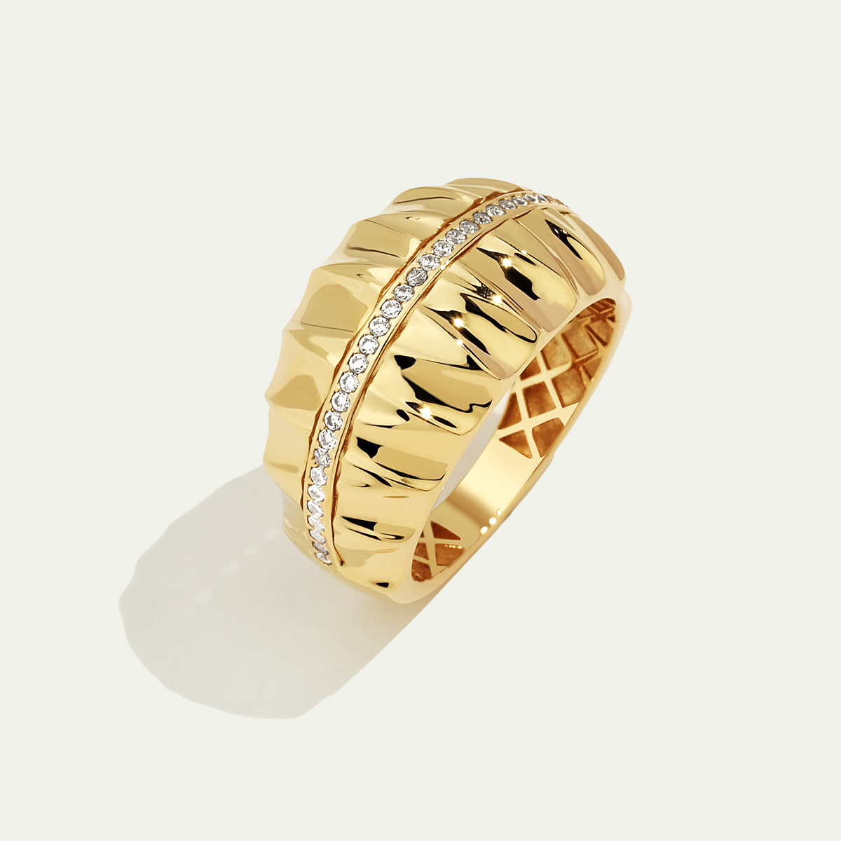 Zarif ve dikkat çekici tasarımıyla öne çıkan Maya 14 Ayar Altın Su Yolu Taşlı Yüzük, katlı dokulu yüzeyiyle modern bir hava taşırken, ortasından geçen parlak taş sırası ışıltılı bir şıklık katar. Dinamik formu sayesinde hem günlük kombinlerde hem de özel davetlerde stilinizi tamamlayan güçlü bir aksesuar olarak öne çıkar. Regold logolu özel kutusunda ve garanti belgesi ile sunulmaktadır.