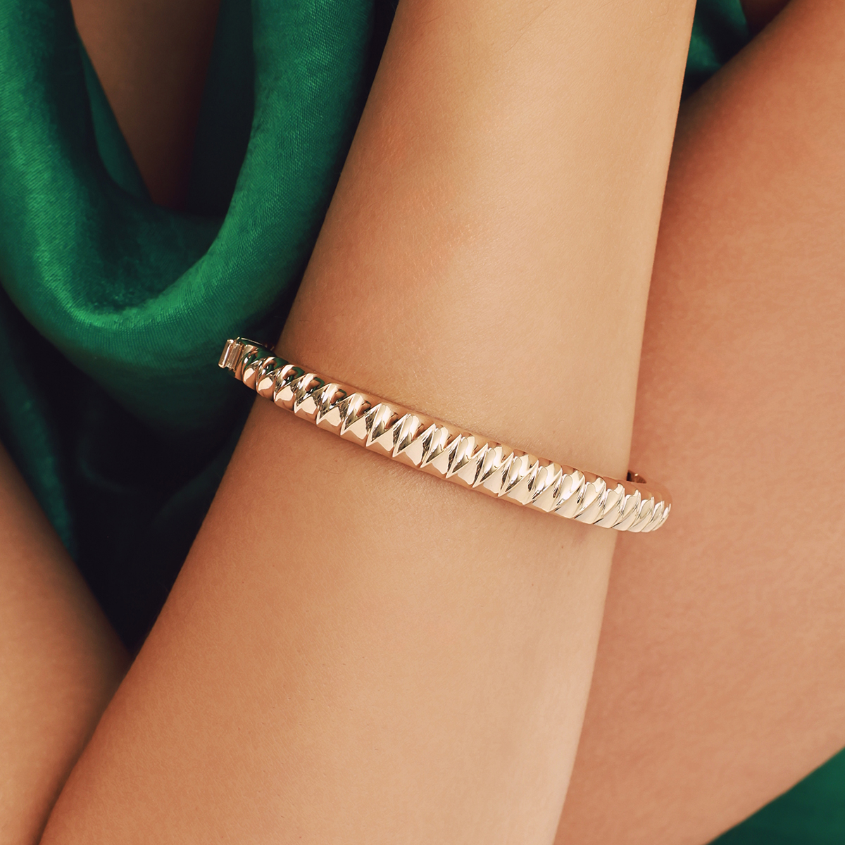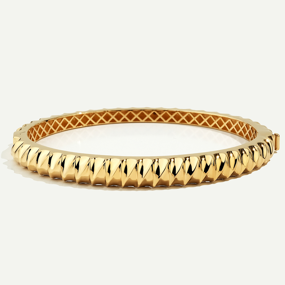 Klasik şıklığı modern bir yorumla buluşturan 14 Ayar Altın Yiv Desenli Kelepçe, dikkat çekici yüzey dokusu ile öne çıkar. Geometrik kabartma deseni, bileziğe güçlü bir karakter kazandırırken, altının ışıltısı zarif bir görünüm sunar. Günlük kullanımda stilinizi güçlendirmek ya da özel davetlerde sofistike bir tamamlayıcı olarak tercih edebilirsiniz. Regold logolu özel kutusunda ve garanti belgesi ile sunulmaktadır.