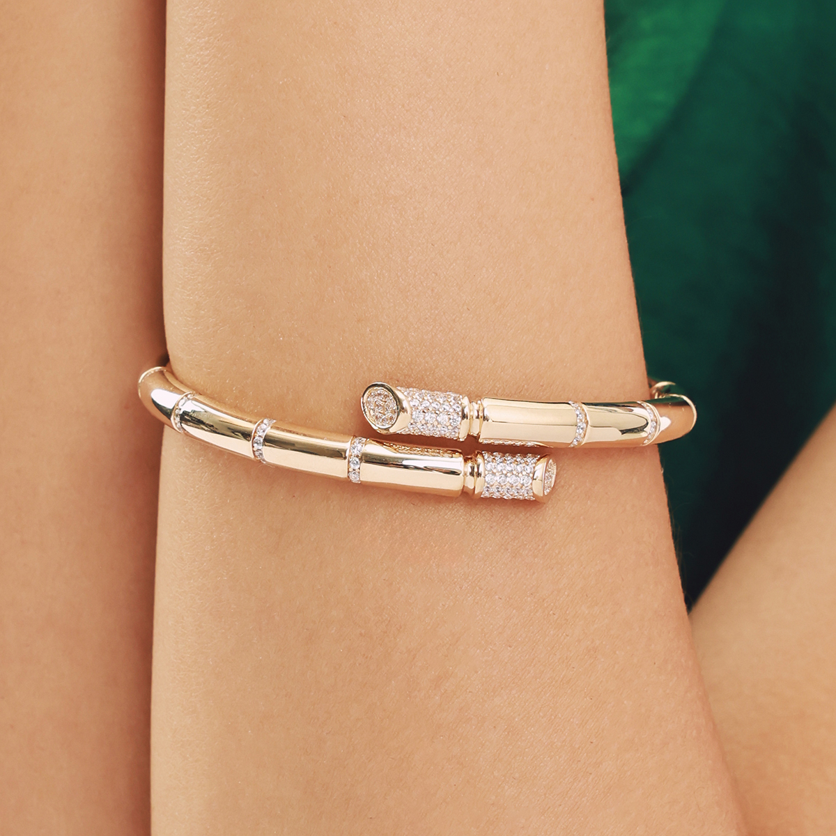 El işçiliğiyle hayat bulan bu 14 ayar altın kelepçe, taşlı detaylarla zenginleştirilmiş doğa esintili tasarımıyla özel koleksiyonunuzun vazgeçilmezi olacak.