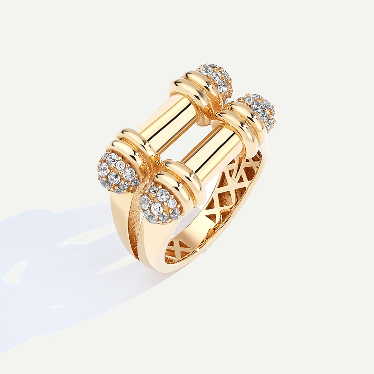 Orta kısmı parlak ve pürüzsüz yüzeye sahip Vega 14 Ayar Altın İkili Silindir Formlu Taşlı Yüzük, zarif bir duruş sergiliyor. İkili sütun formu yüzüğe mimari bir karakter katarken, uçlardaki taş detayları parıltılı bir vurgu oluşturuyor; sade ama dikkat çekici tasarımıyla hem günlük stilinizi tamamlar hem de şık davetlerde öne çıkar. Regold logolu özel kutusunda ve garanti belgesi ile sunulmaktadır.