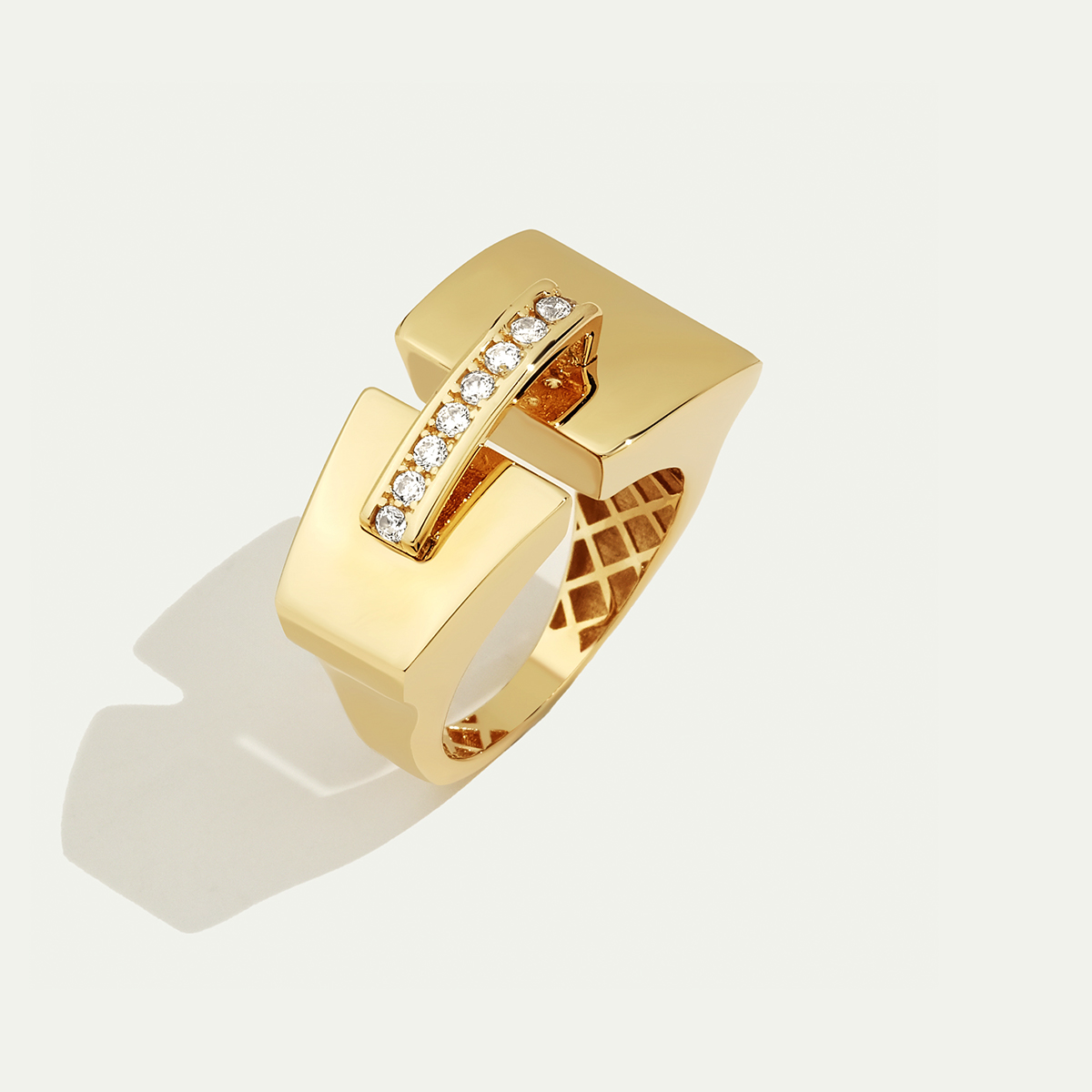 Güçlü hatlarıyla dikkat çeken bu 14 ayar altın yüzük, keskin geometrik formu ve üzerinde yer alan taşlı köprü detayıyla modern bir yorum sunar. Parlak yüzeyiyle göz alıcı bir ışıltı kazandırırken, özgün tasarımı sayesinde stiline cesur bir dokunuş yapmak isteyenler için ideal bir seçenektir.