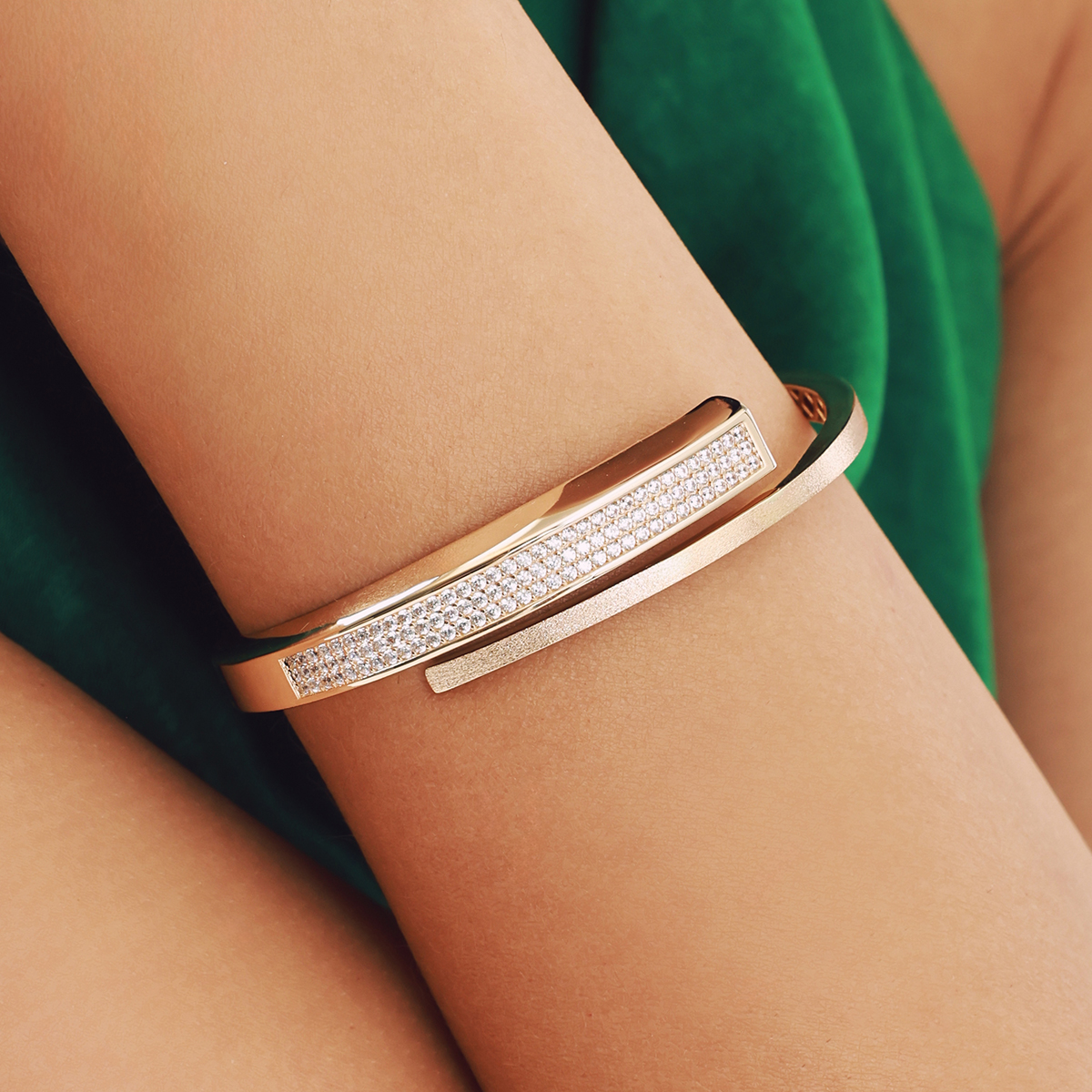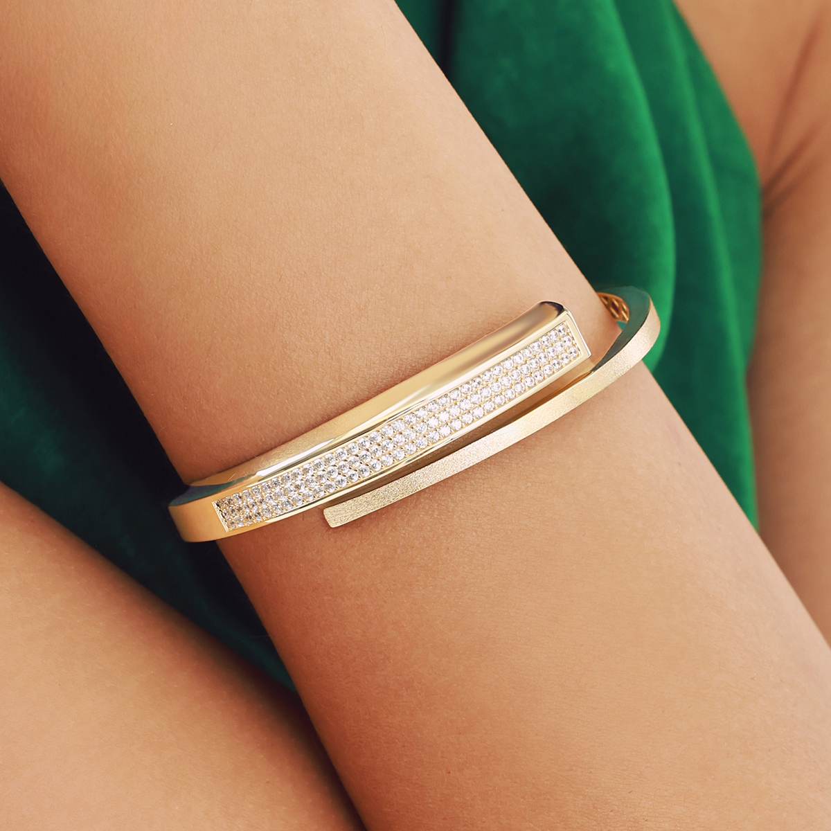 Modern çizgilere sahip bu 14 ayar altın kelepçe, mat ve parlak dokuların uyumunu zarif taş detaylarıyla birleştiriyor. Göz alıcı taş sıraları bileziğe ışıltılı bir şıklık katarken, mat yüzey tasarımı modern ve sofistike bir hava sunuyor. Günlük kombinlerden özel davetlere kadar her ortamda şıklığınızı tamamlar.
