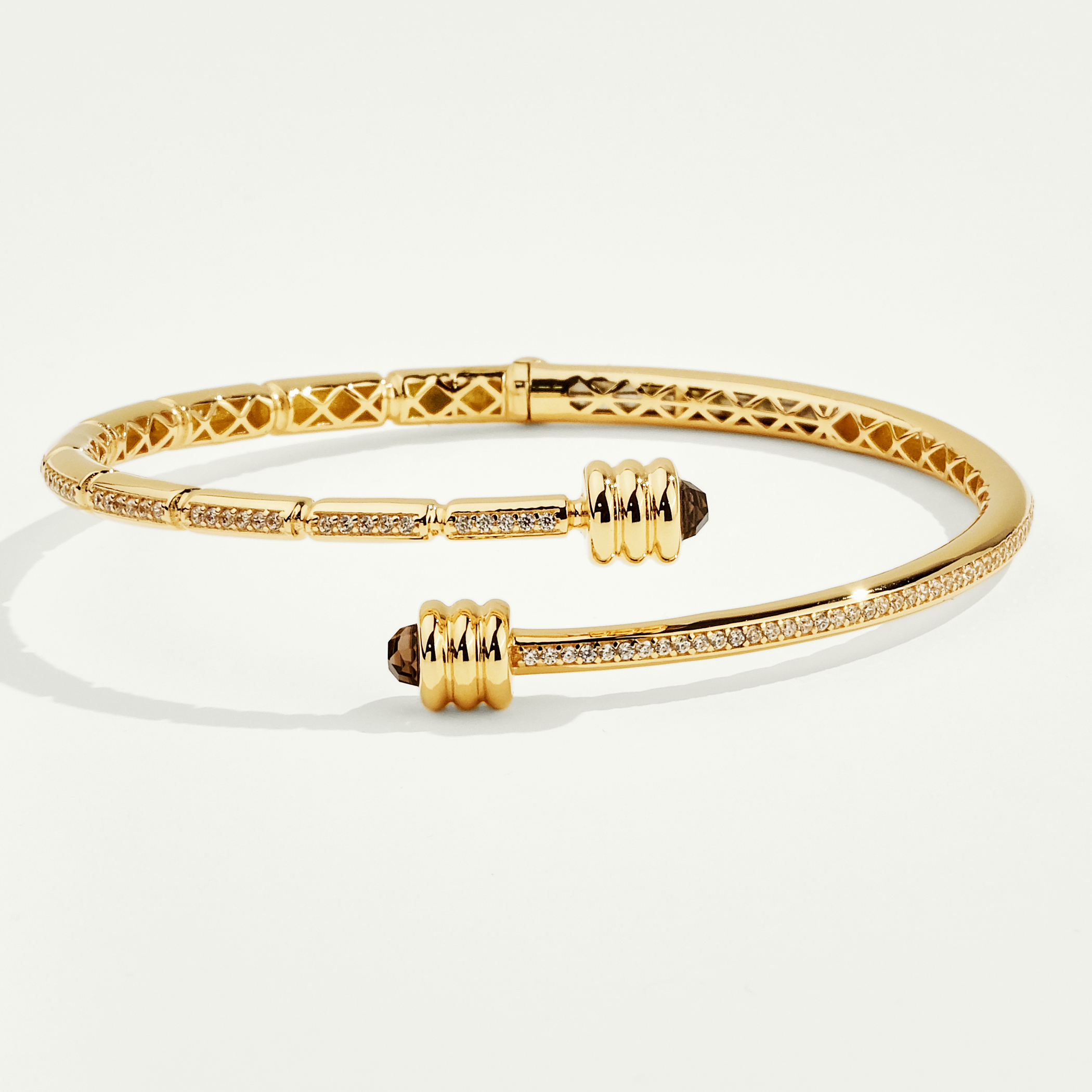 Mimari şıklık ve göz alıcı zarafeti birleştiren bu eşsiz tasarım, Vega 14 Ayar Altın Minimal Kahverengi Taşlı Kelepçe, parlak altından üretilmiş açık formlu bir bileziği ifade eder. Kelepçenin her iki ucu, kahverengindeki büyüleyici, yivli silindir formlu taş detaylarıyla vurgulanır. Ayrıca gövdenin ön yüzeyi, zarif dikey barlar içine yerleştirilmiş parıltılı beyaz taş sıralarıyla dikkat çekici bir ışıltı sunar. Çapraz desenli iç yüzey detayıyla lüks bir incelik kazanan bu model, modern stilinize sanatsal ve cesur bir dokunuş katmak için ideal bir parçadır. Regold logolu özel kutusunda ve garanti belgesi ile sunulmaktadır.