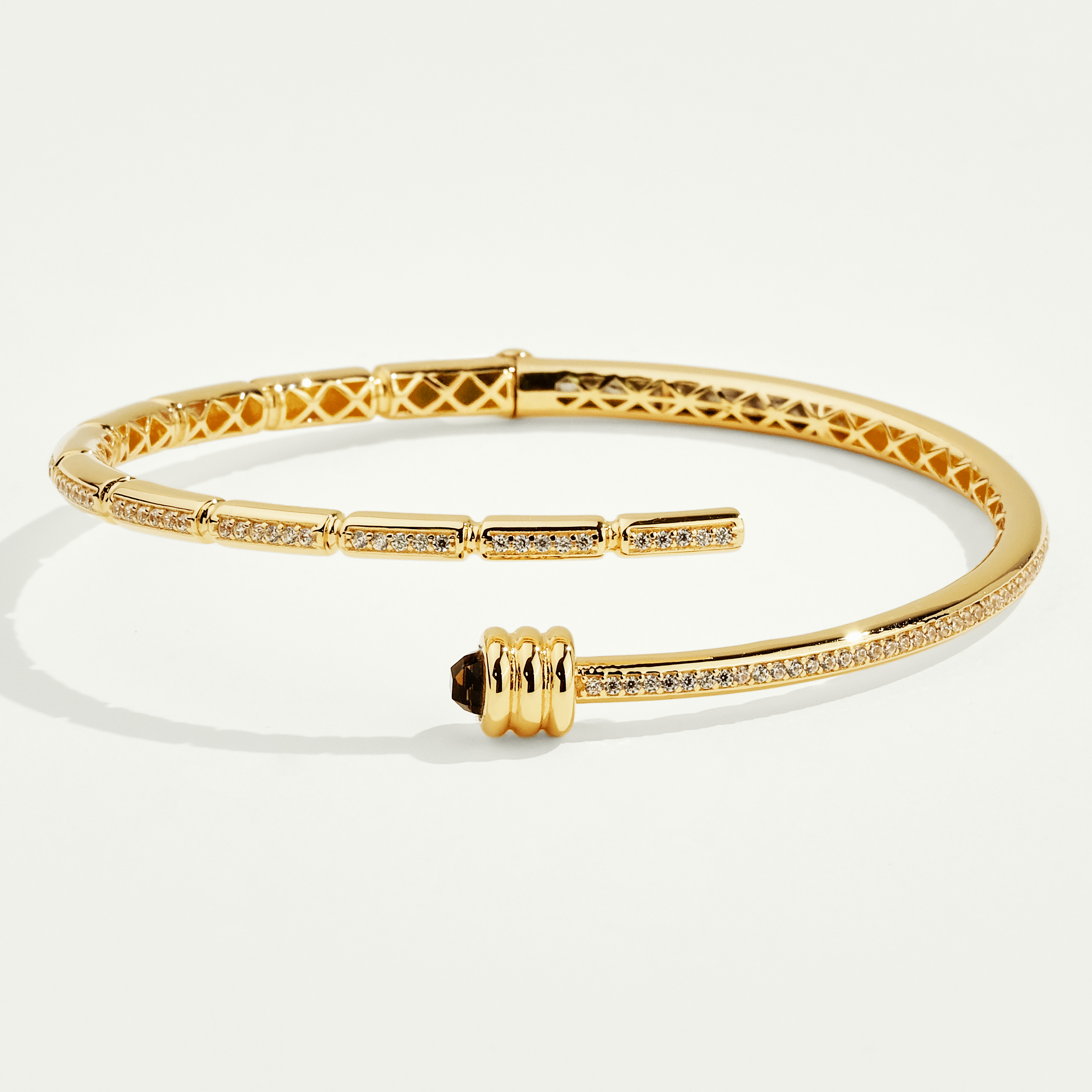 Mimari şıklık ve göz alıcı zarafeti birleştiren bu eşsiz tasarım, Vega 14 Ayar Altın Minimal Kahverengi Taşlı Kelepçe adıyla, parlak altından üretilmiş açık formlu bir bileziği ifade eder. Kelepçenin bir ucu, derin kahverengi renkteki büyüleyici, yivli silindir formlu taş detaylarıyla vurgulanır. Ayrıca gövdenin ön yüzeyi, zarif dikey barlar içine yerleştirilmiş parıltılı beyaz taş sıralarıyla dikkat çekici bir ışıltı sunar. Çapraz desenli iç yüzey detayıyla lüks bir incelik kazanan bu model, modern stilinize sanatsal ve cesur bir dokunuş katmak için ideal bir parçadır. Regold logolu özel kutusunda ve garanti belgesi ile sunulmaktadır.