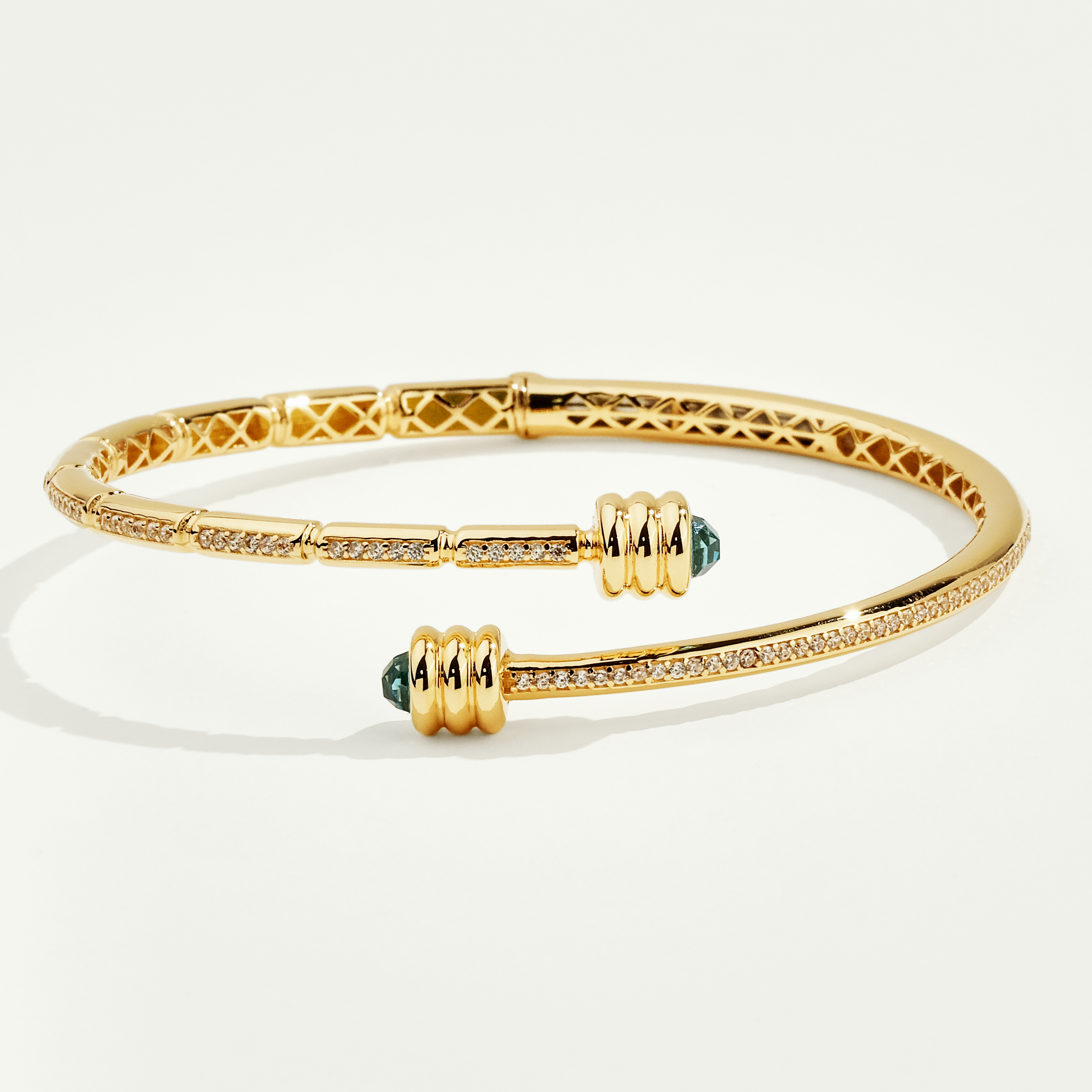 Mimari şıklık ve göz alıcı zarafeti birleştiren bu eşsiz tasarım, Vega 14 Ayar Altın Minimal Mavi Taşlı Kelepçe adıyla, parlak altından üretilmiş açık formlu bir bileziği ifade eder. Kelepçenin her iki ucu, derin mavi renkteki büyüleyici, yivli silindir formlu taş detaylarıyla vurgulanır. Ayrıca gövdenin ön yüzeyi, zarif dikey barlar içine yerleştirilmiş parıltılı beyaz taş sıralarıyla dikkat çekici bir ışıltı sunar. Çapraz desenli iç yüzey detayıyla lüks bir incelik kazanan bu model, modern stilinize sanatsal ve cesur bir dokunuş katmak için ideal bir parçadır. Regold logolu özel kutusunda ve garanti belgesi ile sunulmaktadır.