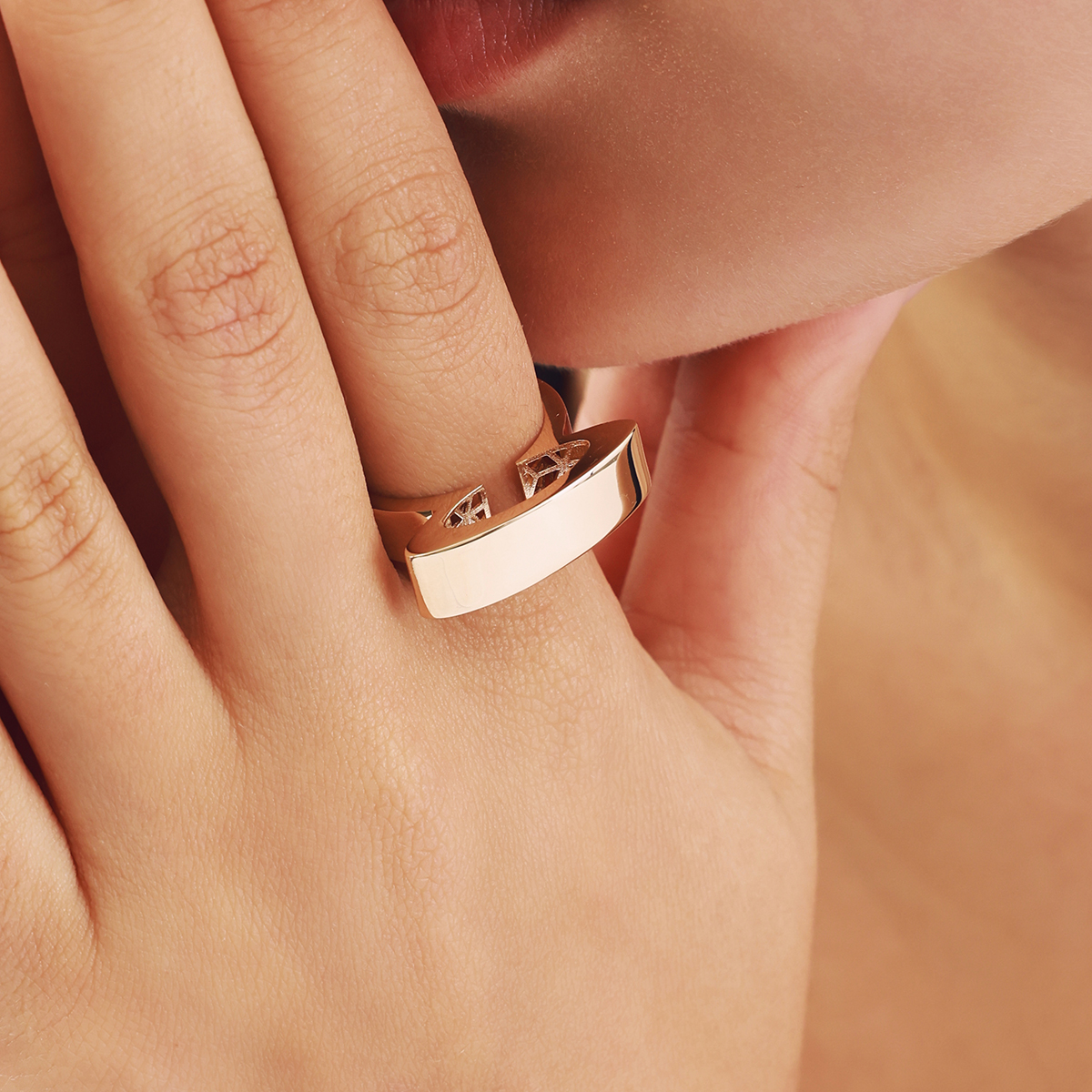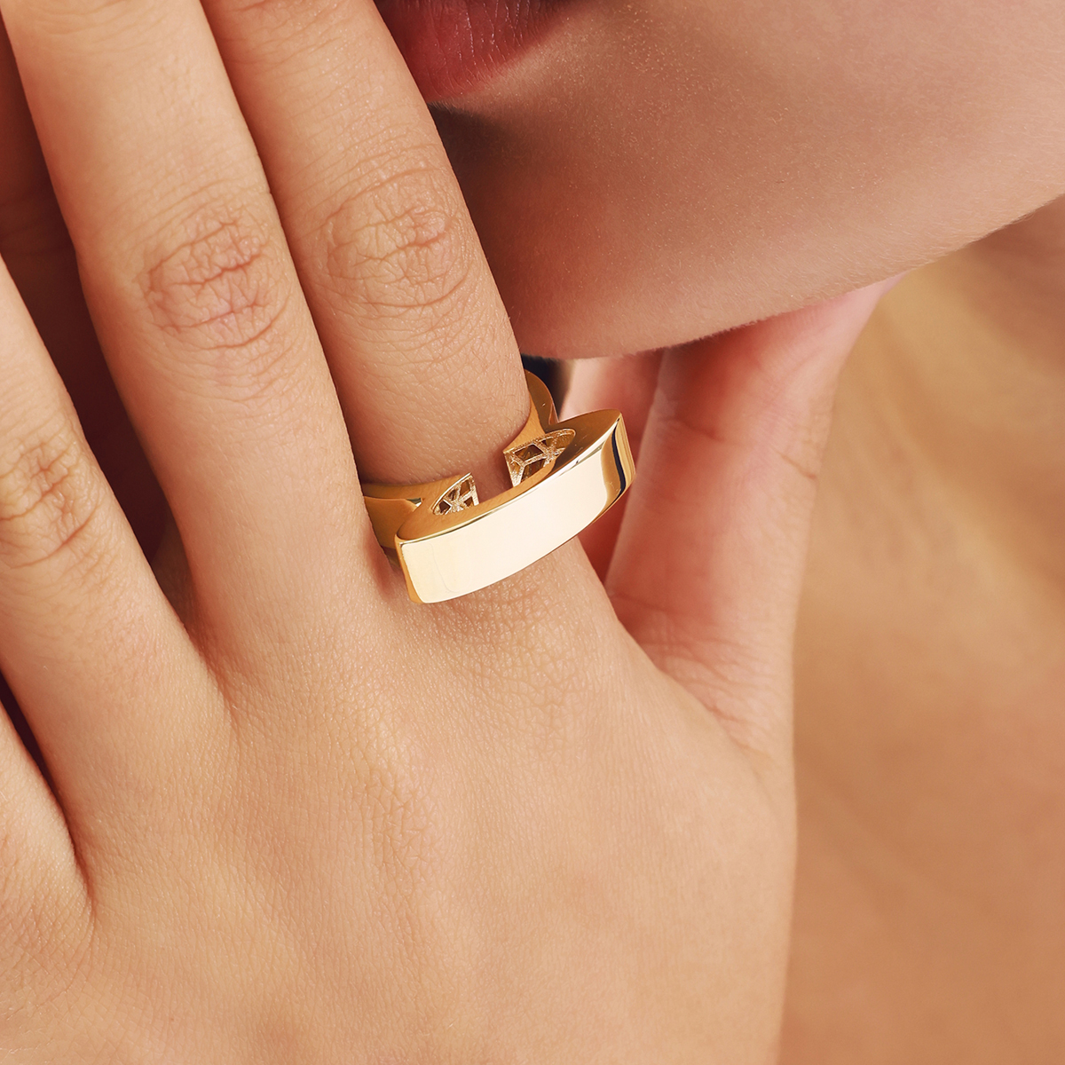 Modern ve iddialı tasarımıyla öne çıkan bu 14 ayar altın yüzük, geniş blok formu sayesinde güçlü bir stil ifadesi yaratır. Köşeli çizgiler ve parlak yüzey altının zarafetini ortaya çıkarırken, tasarımın mimari havası yüzüğü sıradışı bir aksesuar haline getirir. Günlük kombinlerde farklı bir dokunuş, özel davetlerde ise dikkat çekici bir şıklık sunar.