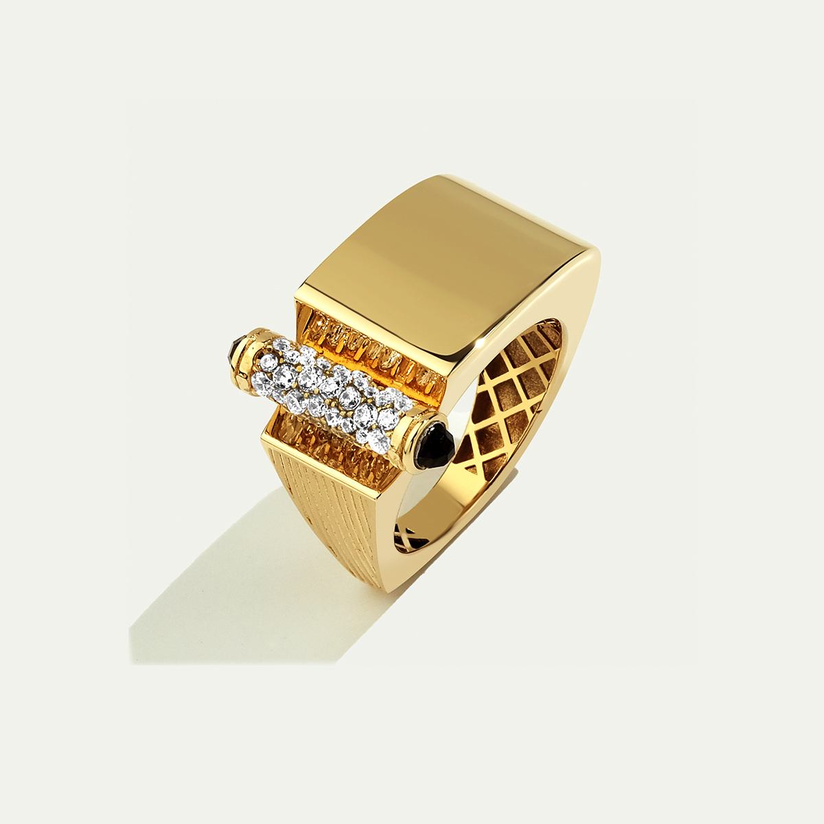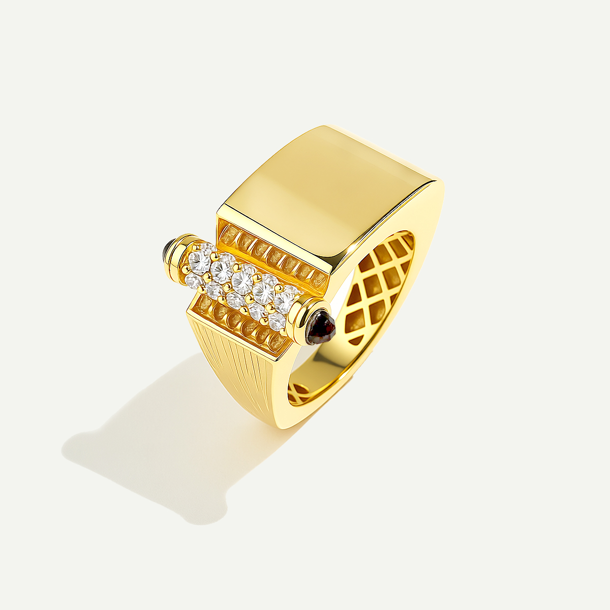 Silindir taş detayının dikkat çekici bir şekilde öne çıktığı 14 Ayar Altın Işıltılı Silindir Formlu Taşlı Yüzük, modern formuyla güçlü bir duruş sergiliyor. Yüzüğün merkezinde yer alan parlak taşlarla bezenmiş silindirik parça, ışığı her açıdan yakalayarak zarif bir ışıltı oluşturuyor. Silindirin her iki ucunda yer alan siyah taşlar tasarıma sofistike bir kontrast katıyor ve altının sıcak tonuyla mükemmel bir uyum yakalıyor. Güçlü çizgilere sahip formu sayesinde bu yüzük hem iddialı hem de modern bir stilin simgesi haline geliyor. Regold logolu özel kutusunda ve garanti belgesiyle birlikte sunulmaktadır.