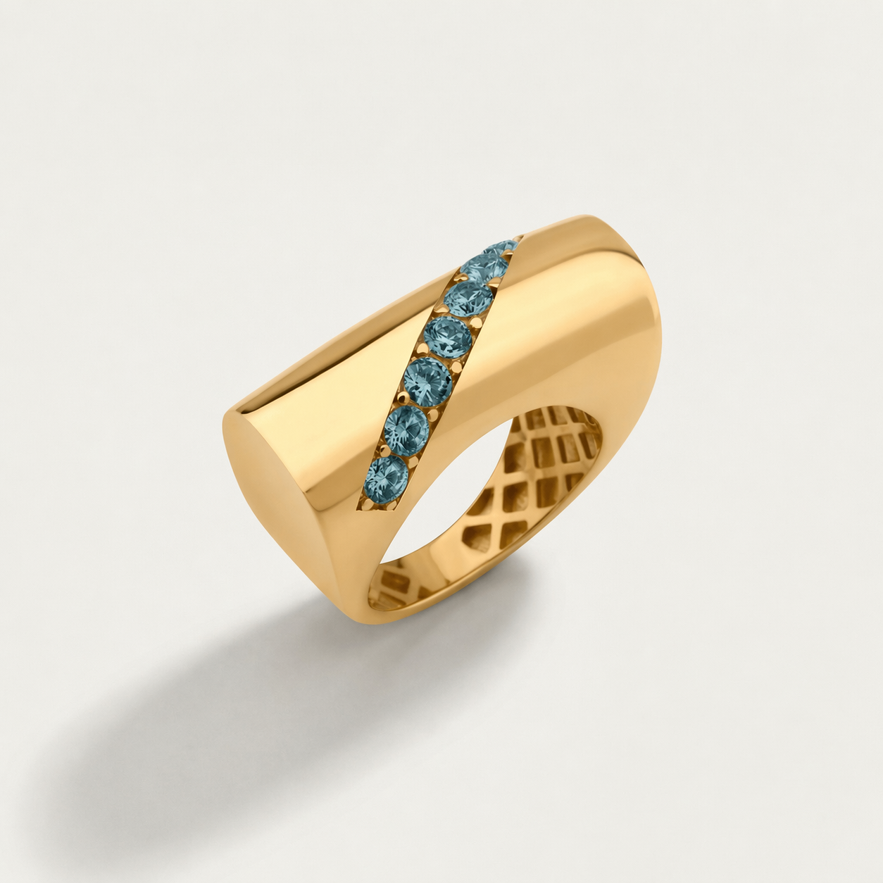 Yuvarlatılmış kubbeli alanı ve merkez boyunca serpiştirilmiş taşlı bandıyla öne çıkan Vega 14 Ayar Altın Mavi Su Yolu Taşlı Yüzük, taşların yanlarda hafifçe küçülmesiyle yüzeye sıcak ve ışıltılı bir görüntü kazandırıyor. Modern tasarımıyla hem günlük kombinlerde hem de özel davetlerde stilinizi zarifçe tamamlar. Regold logolu özel kutusunda ve garanti belgesiyle sunulmaktadır.